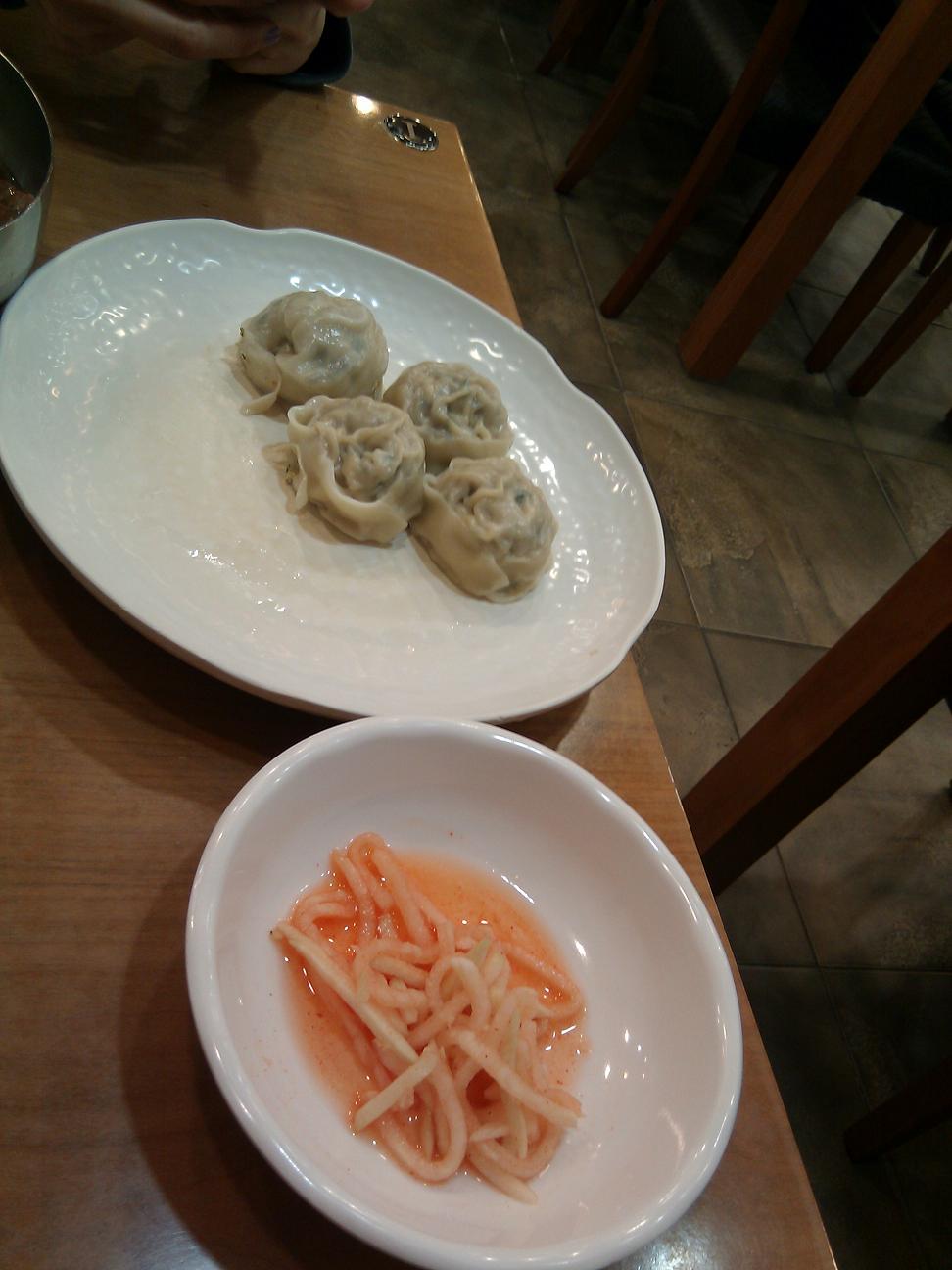 We also ordered a side of steamed dumplings (mandu). We finished off all the dumplings but were unable to finish both noodle dishes. The side dish you see beside the mandu came with the Naengmyeon and was either a pickled radish, cucumber or squash like fruit/vegetable (possibly a Korean Pear as wikipedia mentions above?). I remember it being light, crunchy and tasty but I can’t recall exactly what it was.