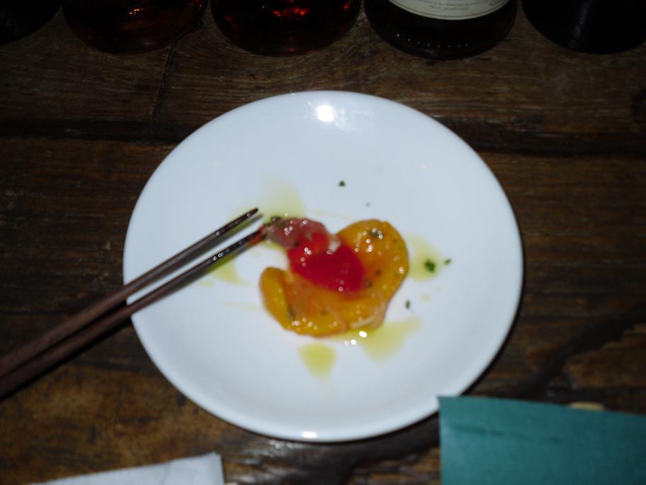 The following morning I woke up a little before lunch and made my way towards the Ghibli Museum. You can read all about it here. After having done so I wandered around the Akihabara neighborhood visiting a few nerd spots and just soaking in the sights and people. I hadn’t planned on going back to the Lyphard but as I exited the metro I felt the need to sit down and socialize over a few drinks before calling it a night. When I walked in both the barman and his assistant beamed a large smile while exclaiming “It’s not Friday!?!” I smiled, took a seat at the bar and said I’d be back on Friday as well :-) On this night the appetizer was some sliced yellow and red peppers, some (what i suspect) was olive oil: