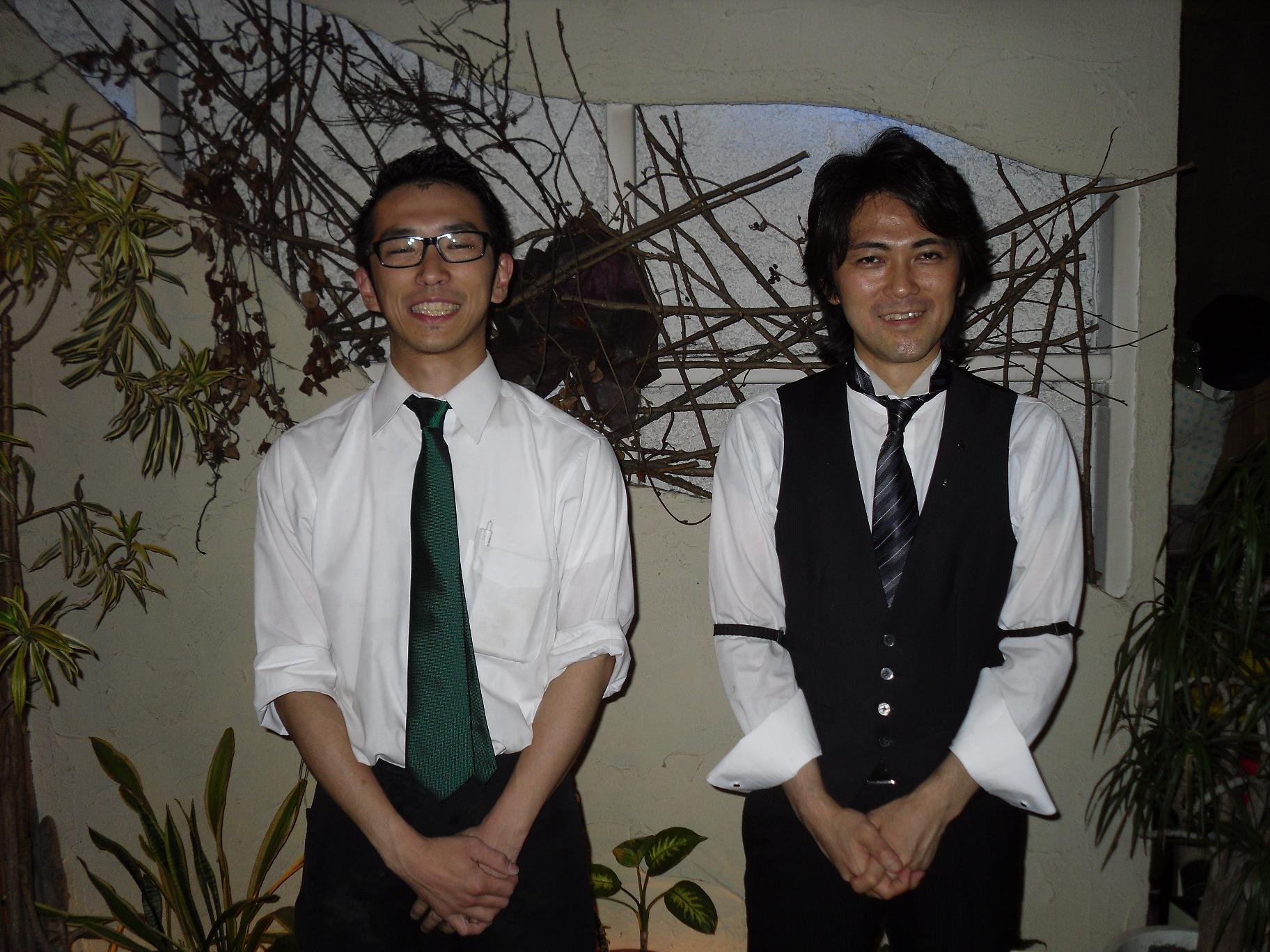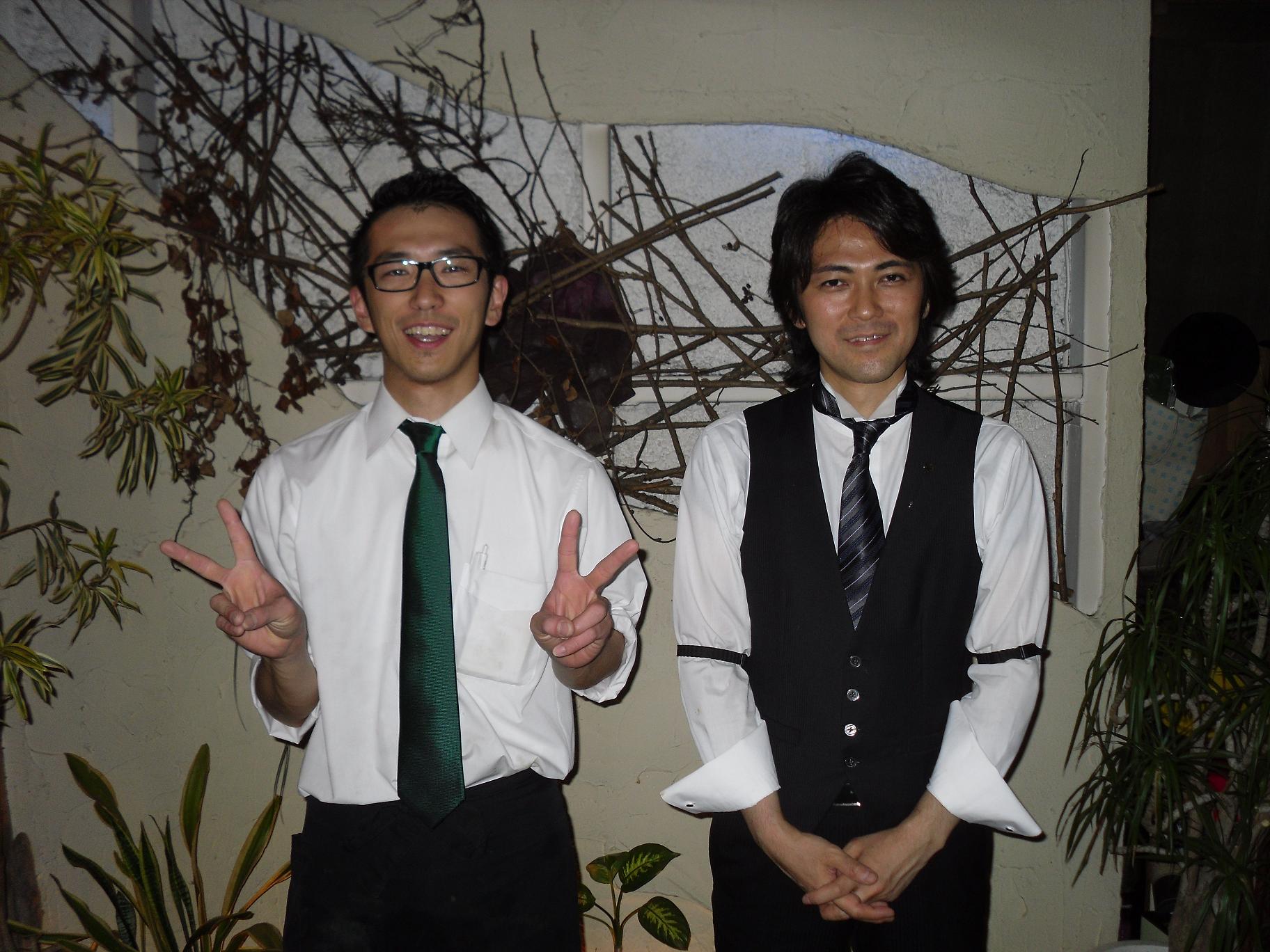 Daisuke on the left and Hosaka on the right. Hosaka is the owner and Daisuke is the ‘character’. His smile and peace symbols are intentional ;-)