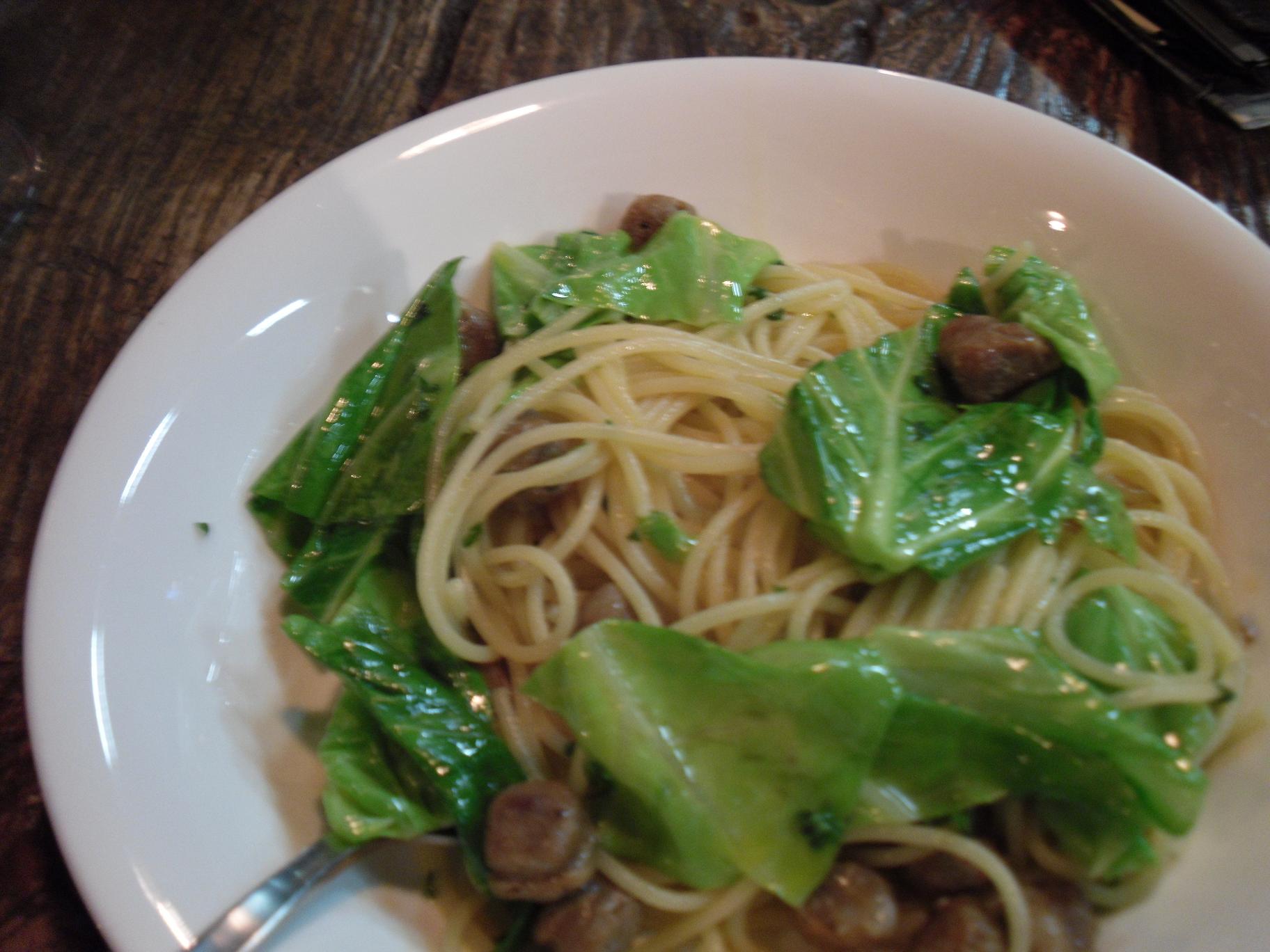 I sat down and ordered this excellent spaghetti pasta dish, which had some cabbage, chorizo (a small delicious spicy Mexican sausage) and what I suspect was some olive oil. The pasta was al dente and cooked with the same care a surgeon uses to operate: