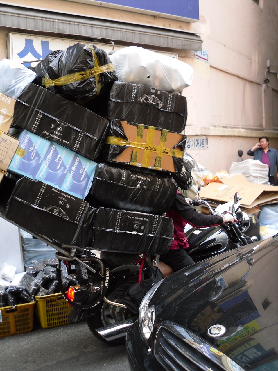 Scooters in South Korea are almost everywhere. You’ll often find delivery drivers on a scooter. I can’t emphasize this enough, absolutely packed and weighed down while delivering all kinds of merchandise. It’s also not unusual for them to drive on the sidewalk either because many of the side/streets wouldn’t necessarily have room for a truck or car to pass through them. Just how much do they pack onto the motorbikes? Have a look at this picture: