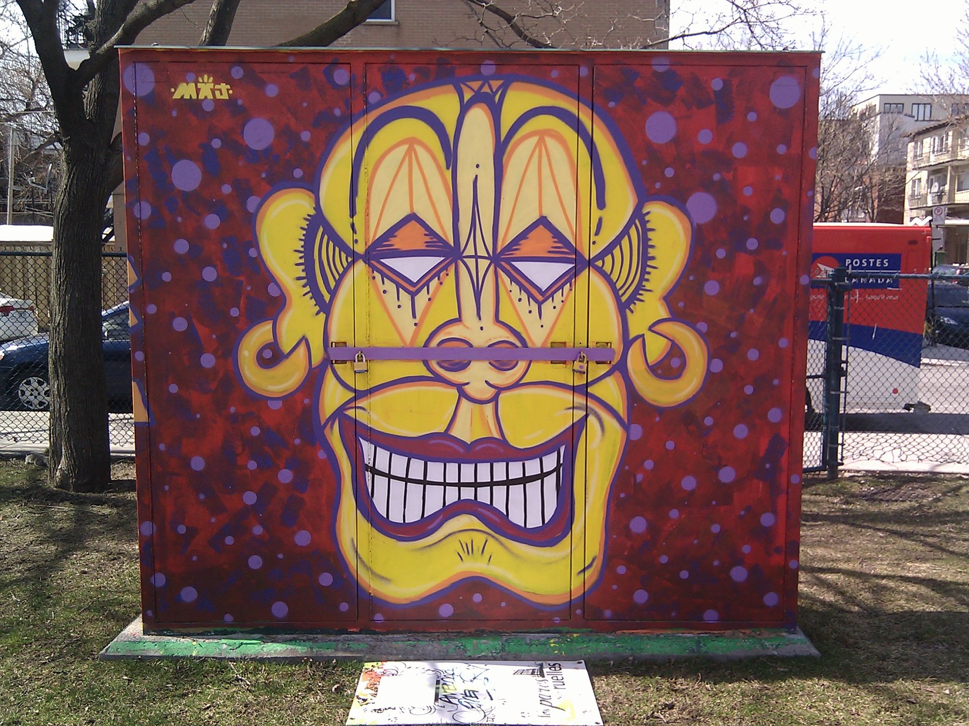 The piece below was located in a park I came across. It appeared to be some type of utility cabinet that belonged to the city. I doubt the city authorized the piece but I think it looks nicer than a large grey/black/metal box in a park.