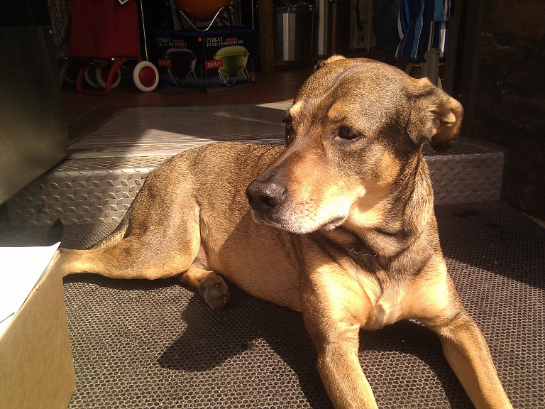 To say that it’s sharp is an understatement. It’s a beautiful one piece stainless steel knife and it’s surprisingly “light” when in your hand. I was getting ready to pay for my purchases, fighting the old Italian ladies at the cash when out of the corner of my eye I saw a dog’s tail wagging. There in one of the aisles was a dog winding his way around the customers. I have had no idea who the dog belonged to but it was obvious that this store was his “home”. Like any dog who has more than his share of attention he/she was very non challant about all the customers inside the store. He stepped outside and proceeded to lay down at the entrance of the store.