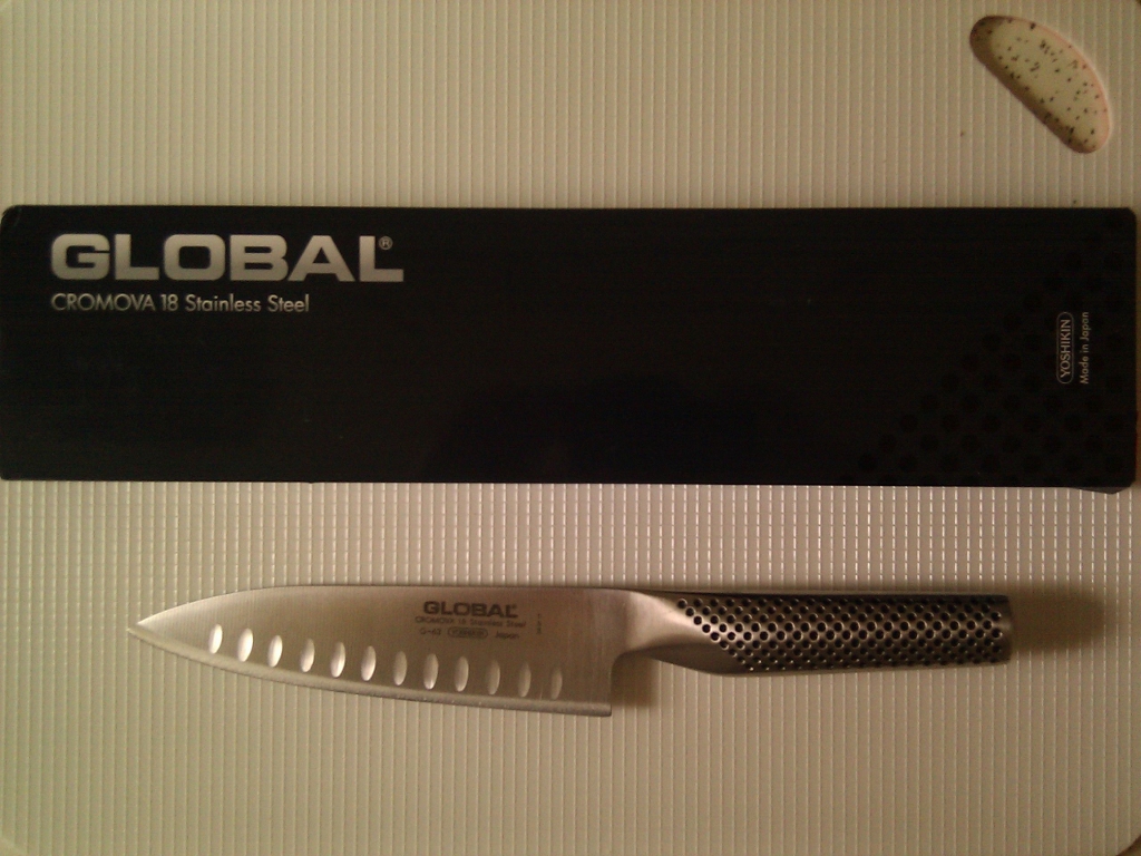 I saw a display case with several of their knives and asked one of the floor staff if I could have a look at them and check their prices. After a few minutes of inspecting the different models I settled on the “Global Cromova 18 Stainless Steel” specimen. I finally have my first real decent kitchen knife. Of course like anything of quality it didn’t come cheap.