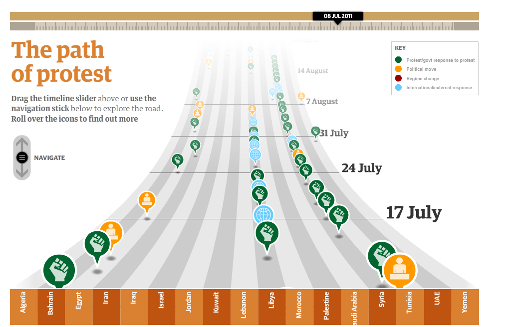 It’s important to bring some things into context: The Arab spring was still in bloom. The best visually informative guide I’ve found of this is at the guardian. I’ve taken a screenshot below to explain how it works. You can use the slider on the top to move forward or backward in the timeline. When you scroll through the timeline you can read articles about events which occurred in that specific country. Each country being indicated on the bottom of the page (and picture below).