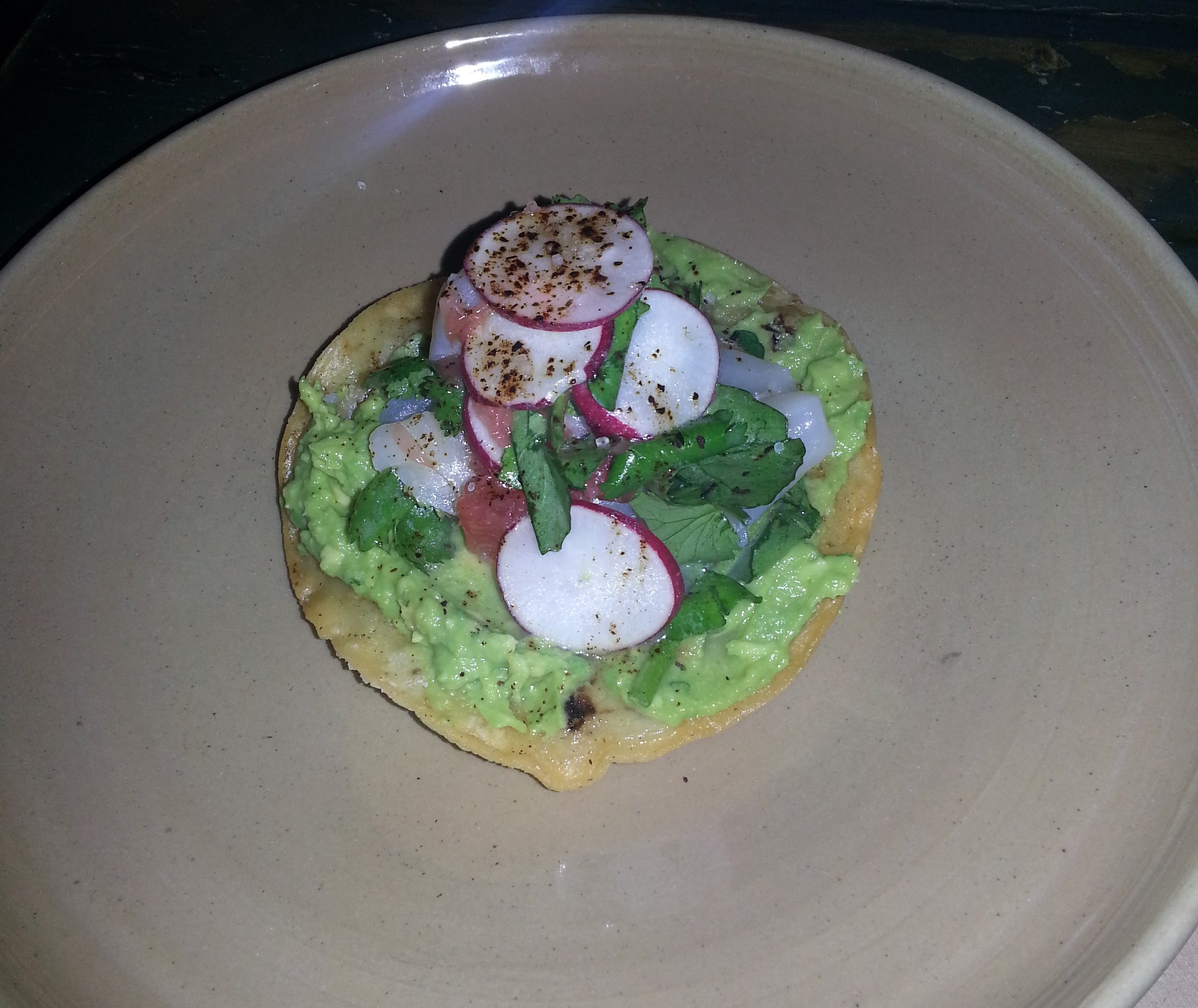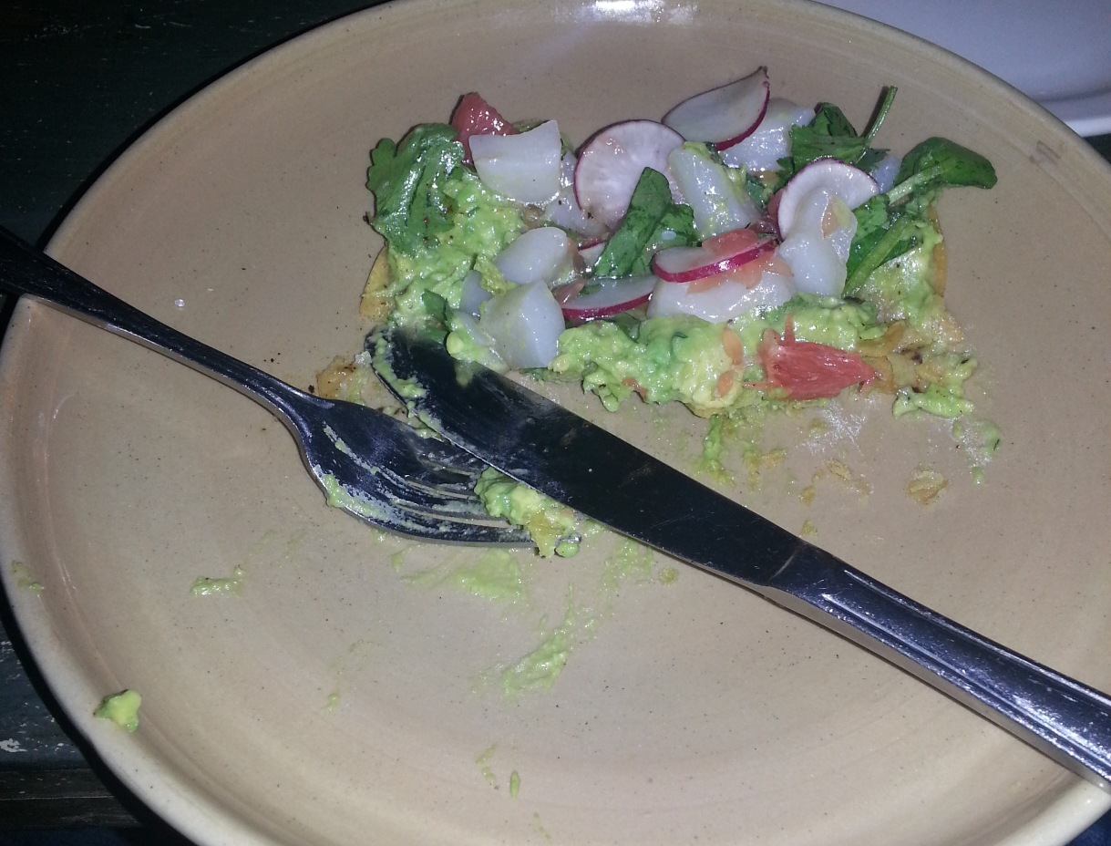 The first time I tried this dish I thought it was delicious. The creaminess of the avocado and scallop went well with the small pieces of radishes and crunchy taco shell. For my first taste of a ceviche I thought it was really good. I had no problems finishing the appetizer by myself (having shared a few pieces with the rest of the table. The second time I ordered the dish I didn’t find it as tasty. Perhaps it was simply a bad batch of scallops or the way it had been made that day. I’ve also seen them use various types of fish once they have run out of fresh scallops in the ceviche. Now you may notice a “red/orange” type fruit in the picture. I believe this may have been grapefruit but I’m not 100% certain and the menu doesn’t clearly indicate it. I’ll ask our friend next time I see him and will then update this post. (Update, confirmed that’s it’s grapefruit June 15th, 2013) Here’s picture #2 of the ceviche which gives you a better view of the contents compared to the above picture: