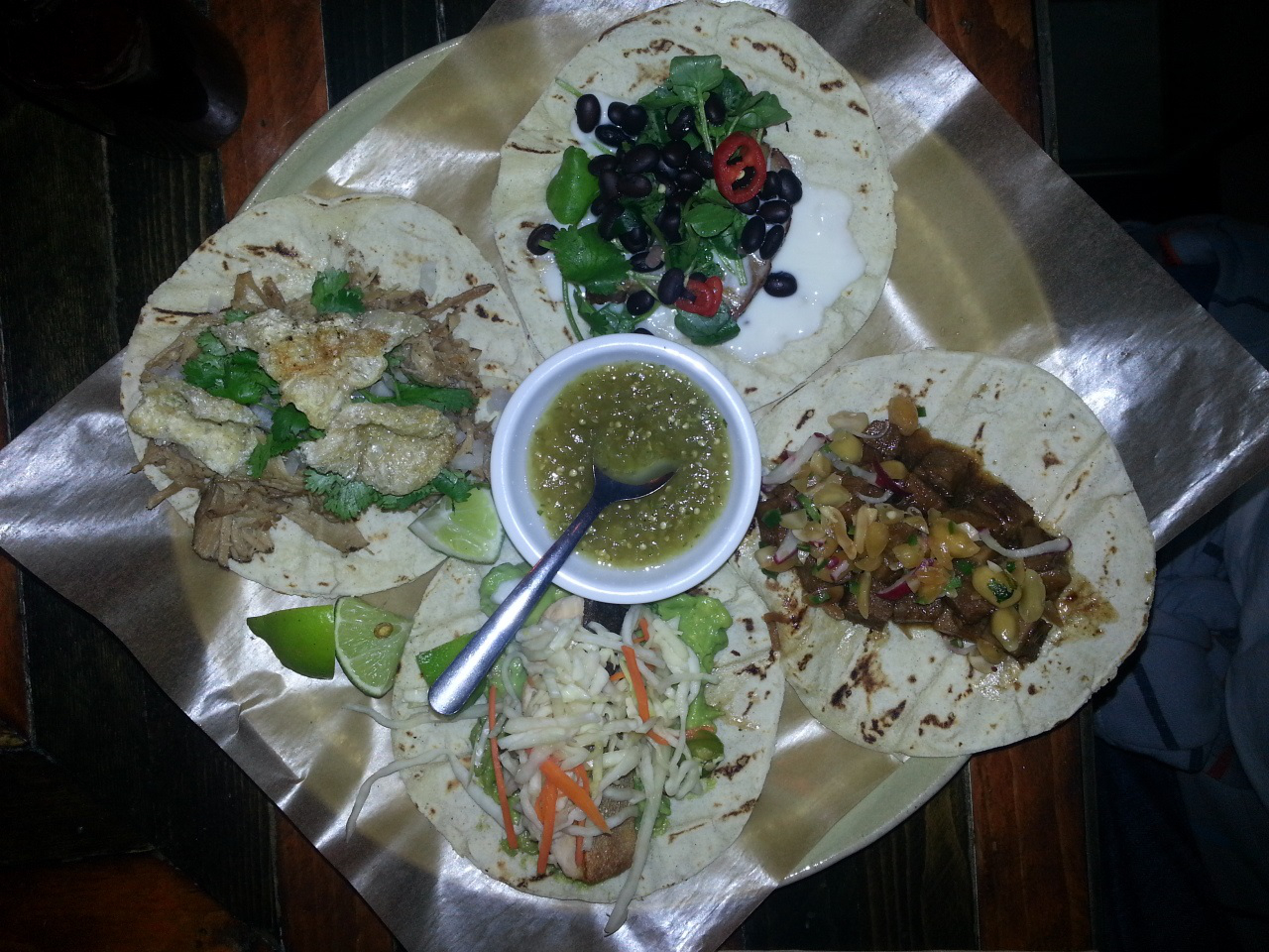 In the picture below you can see the order from my most recent visit. Starting at the top (or 12 o’clock position) and going clockwise: We have the the black bean, jalapeno, walnut, beet and creme taco. To it’s right we have the veal tongue, which was chopped into little cubes, a peanut salsa and small pieces of radishes. Followed by the fish taco, which had a guacamole base, grilled arctic char and marinated cabbage. Finally we have the single (pork) carnitas taco. It includes some chopped onions, coriander, fried lard and a side of salsa verde.