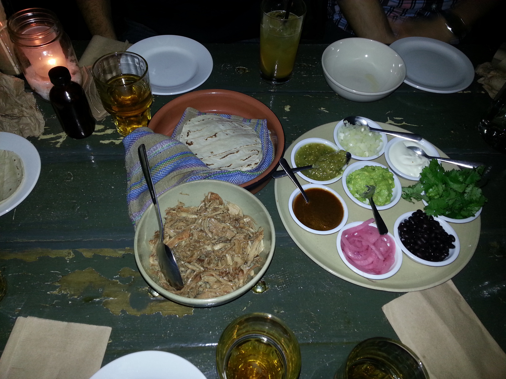 Having been there a few times I’ve had a chance to sample a large portion of the menu. One of our favorites when we’re there in a group is to order the “carnitas pour quatre”. That’s to say the Carnitas for 4. It’s the large bowl of moist pork meat that you see below. It comes with a platter of side dishes which you can use to spice up the taste of the tacos. It comes with a large bundle of warm moist tacos.