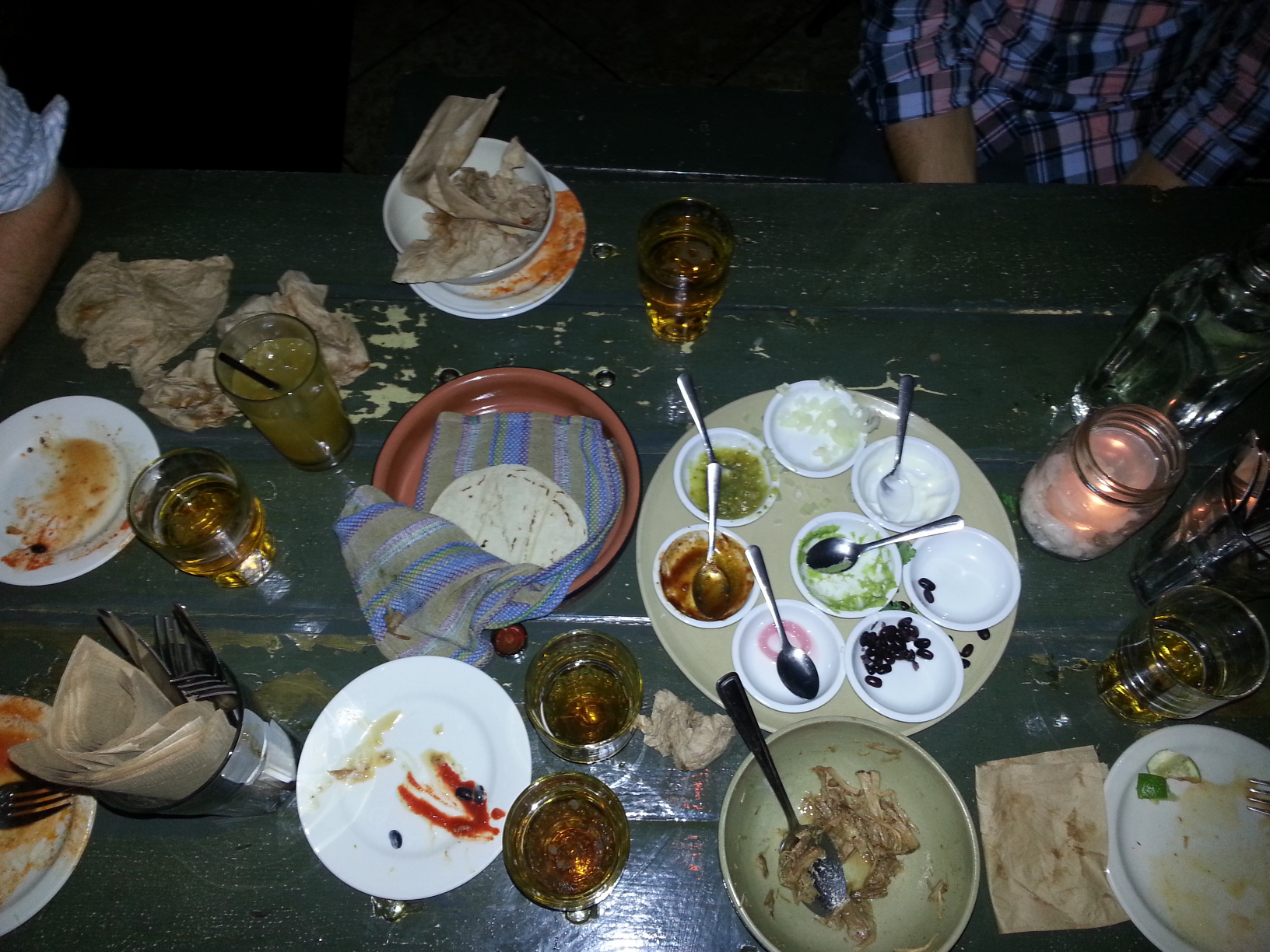 I feel I should mention that the taco’s are not made onsite. The reason is simple; they go through too many of them each day to make them fresh. They would need to have a few individuals doing nothing but taco’s all day long. So instead they get nice fresh taco’s delivered from a company which does just that. Here are two pictures below, the before and after as I like to call it. The plate as it looked when it was dropped off on our table and the plate after we had finished eating.