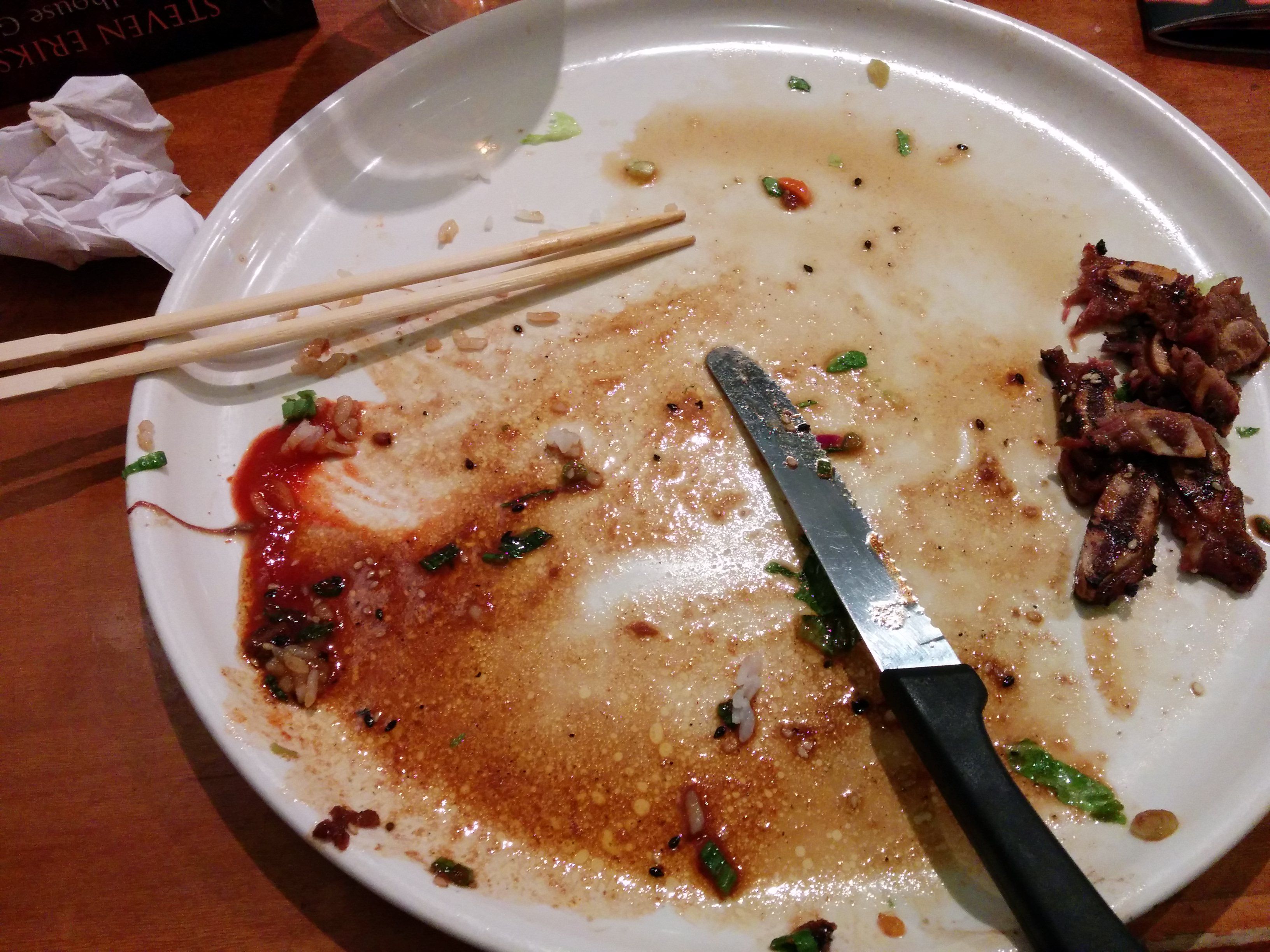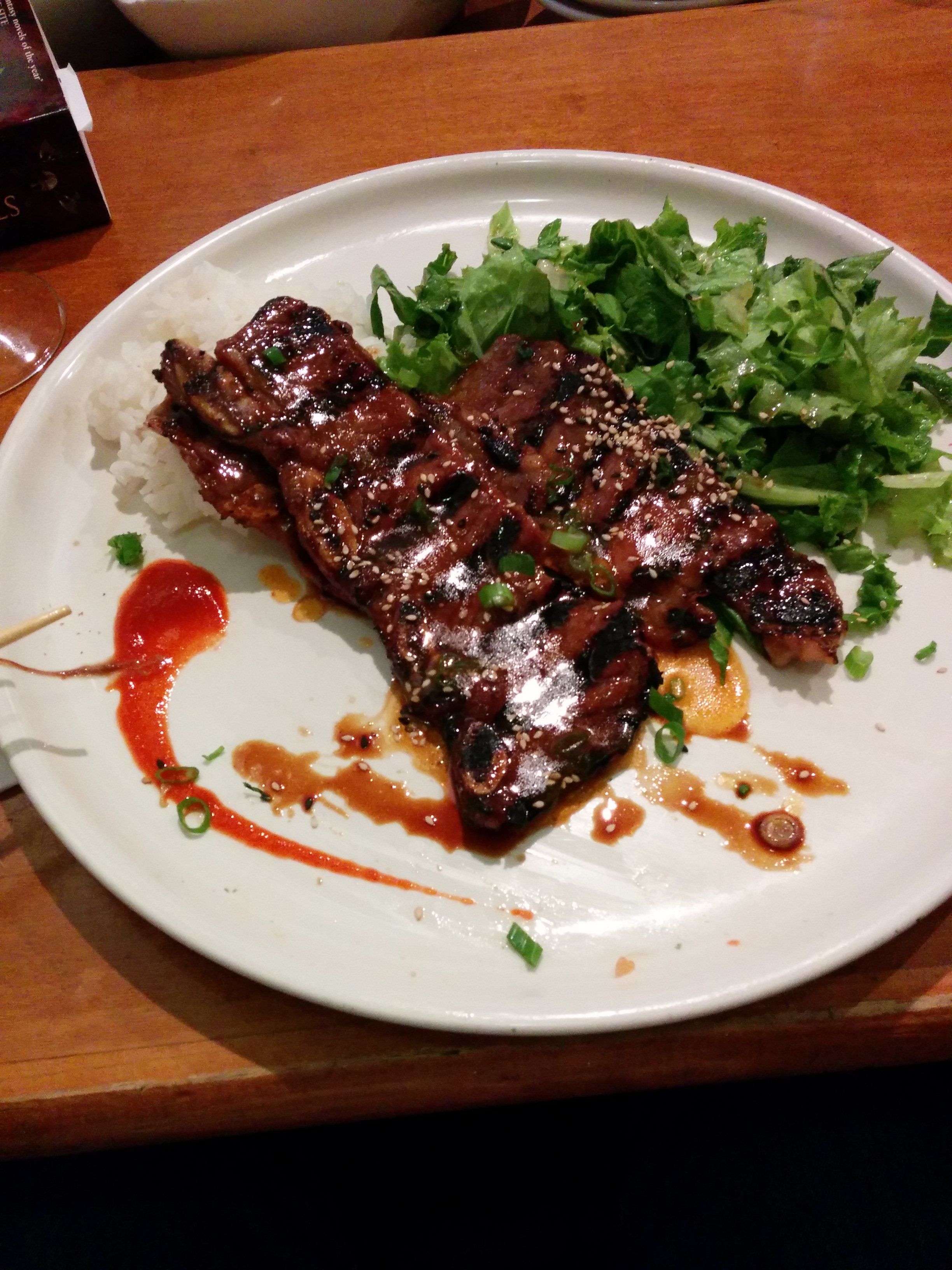 The dumplings were delicious (I assume home made but did not confirm). The Kalbi ribs were tender,moist, juicy and absolutely tasty. The accompanying salad and rice were the perfect partners in crime. That red sauce you see on both plates is the ever popular Sriracha sauce.