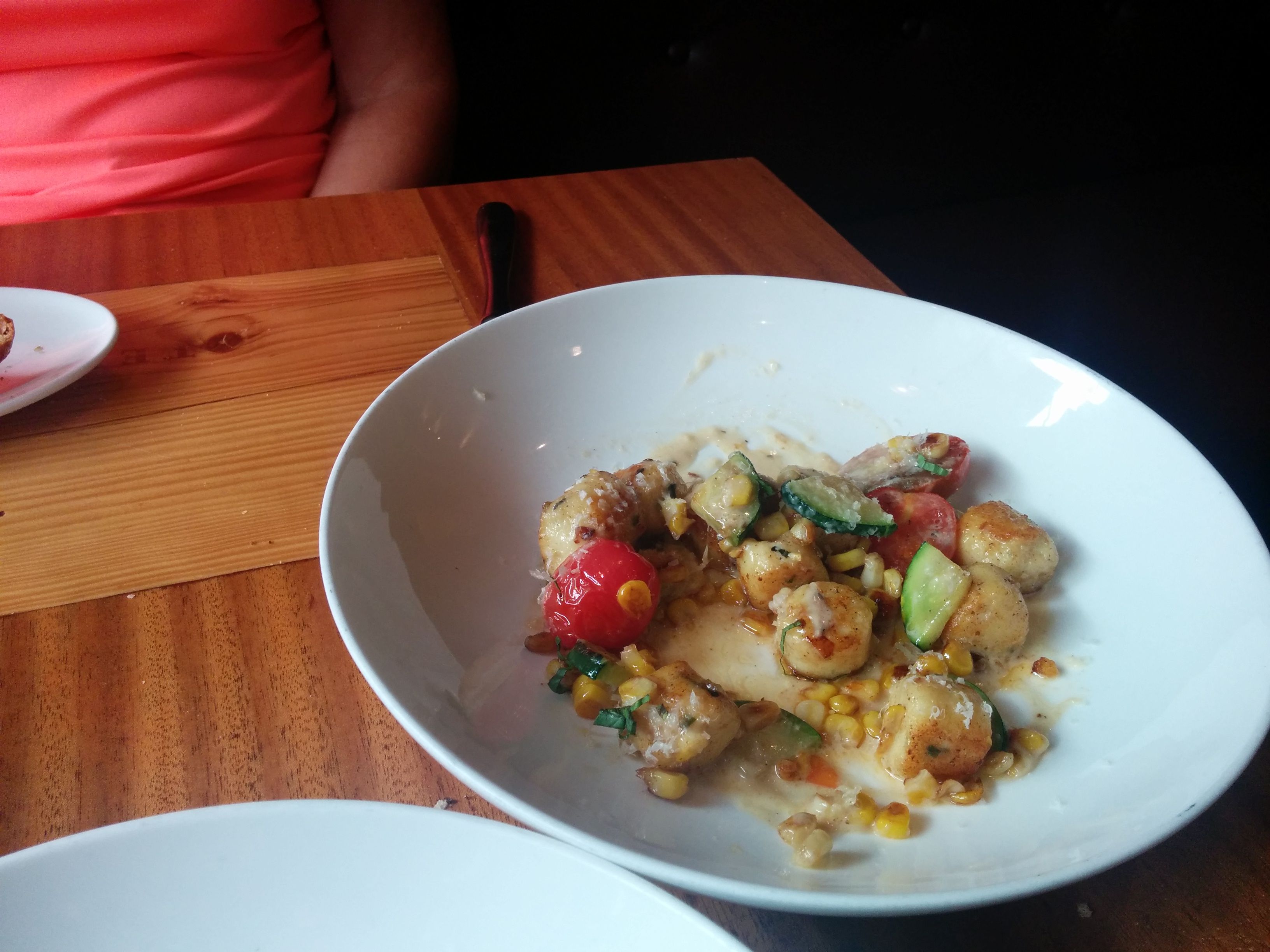 This was followed by us sharing three plates, Belgian Endive Salad: Fourme D’ambert (cow), Blackberries, Toasted Walnuts, Orange Vinaigrette. The Parisienne Gnocchi: Cherry Tomatoes, Zucchini, Corn, Brown Butter-Lemon Sauce and finally the Mussels in White Wine Broth: PEI Mussels, White Wine, Caramelized Fennel, Arbol Chili Oil