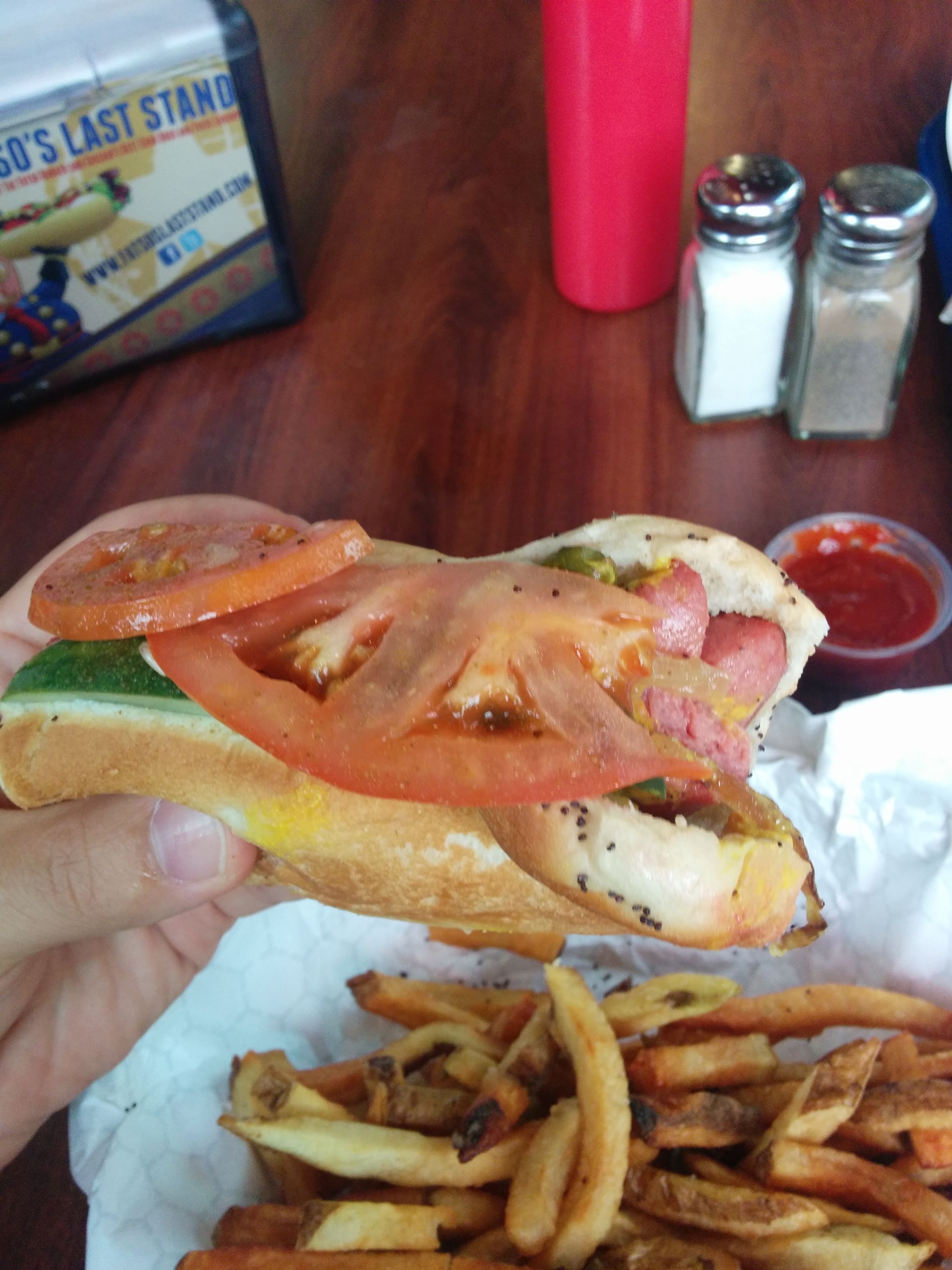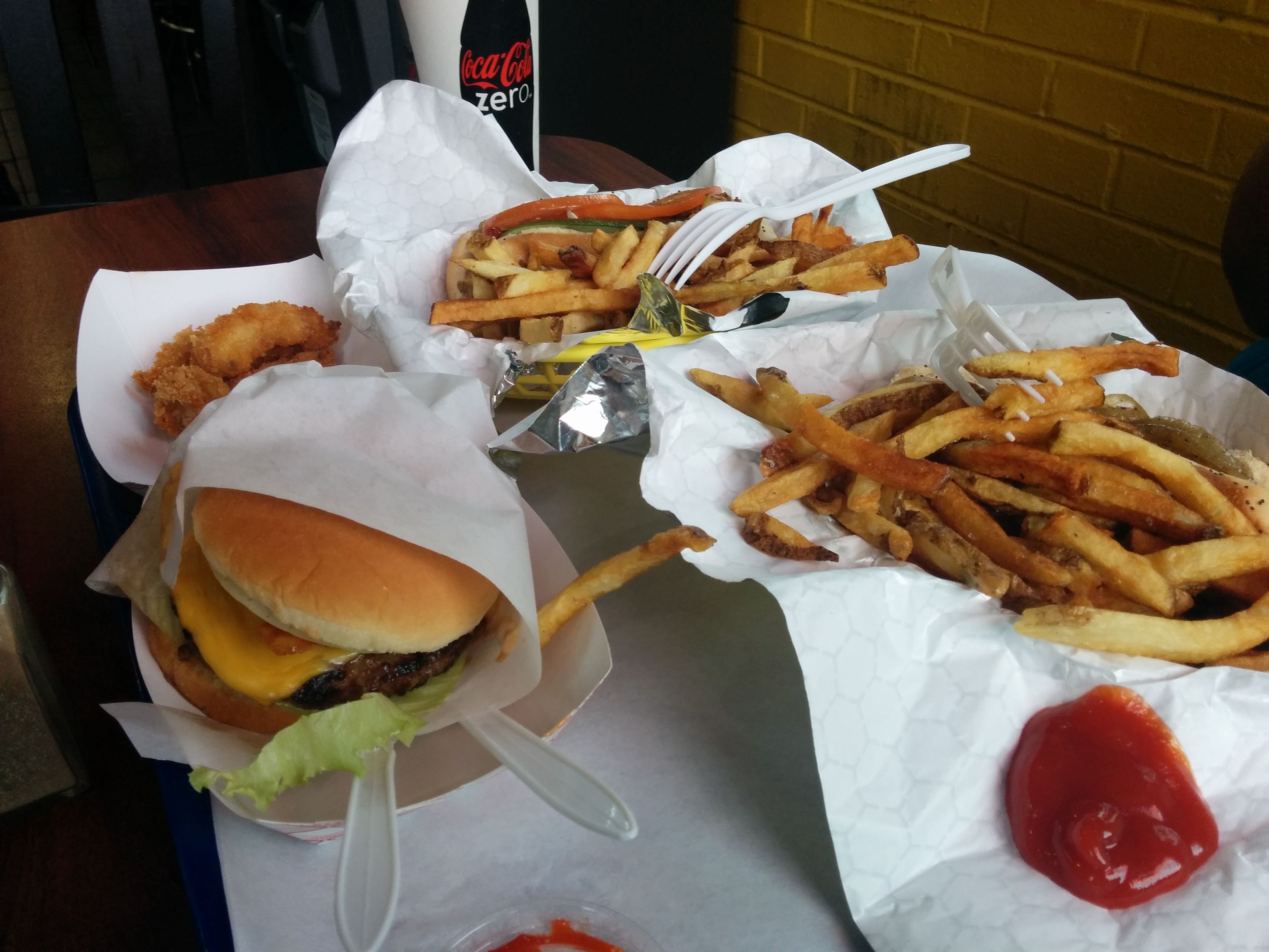 We shared a Fatso burger with cheese and bacon (everything on it), a char broiled polish with everything on it and a char broiled hot doc with everything but the pickle and tomatoes. On top of that we had some fries and a small order of shrimp. All in all what you would expect from this type of greasy spoon/diner restaurant. The staff was welcoming, the food didn’t take too long to prepare.