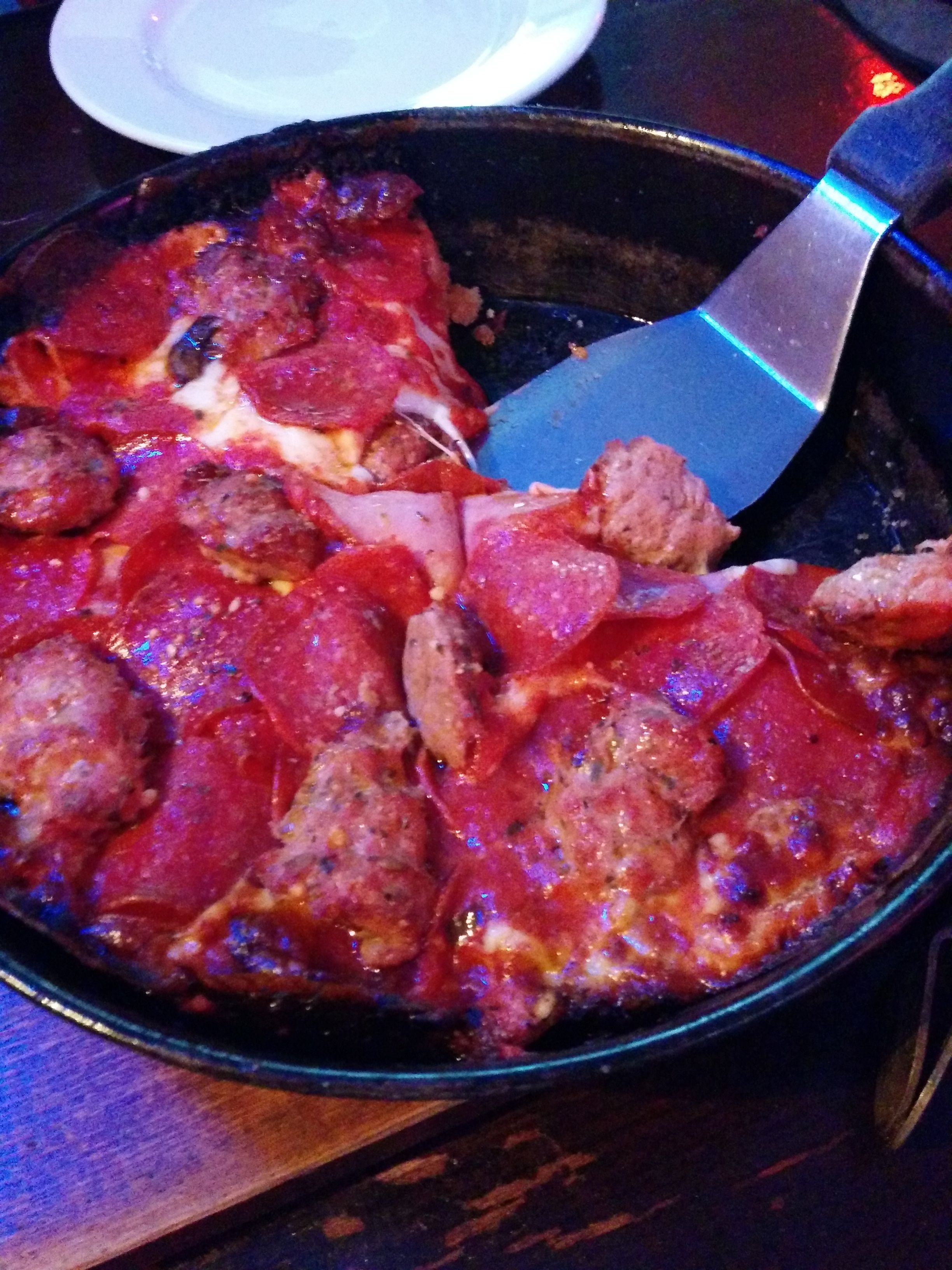 Mom ordered a personal sized deep dish with Olives and sausage and I went with a 10″ Canadian bacon, sausage and pepperoni.