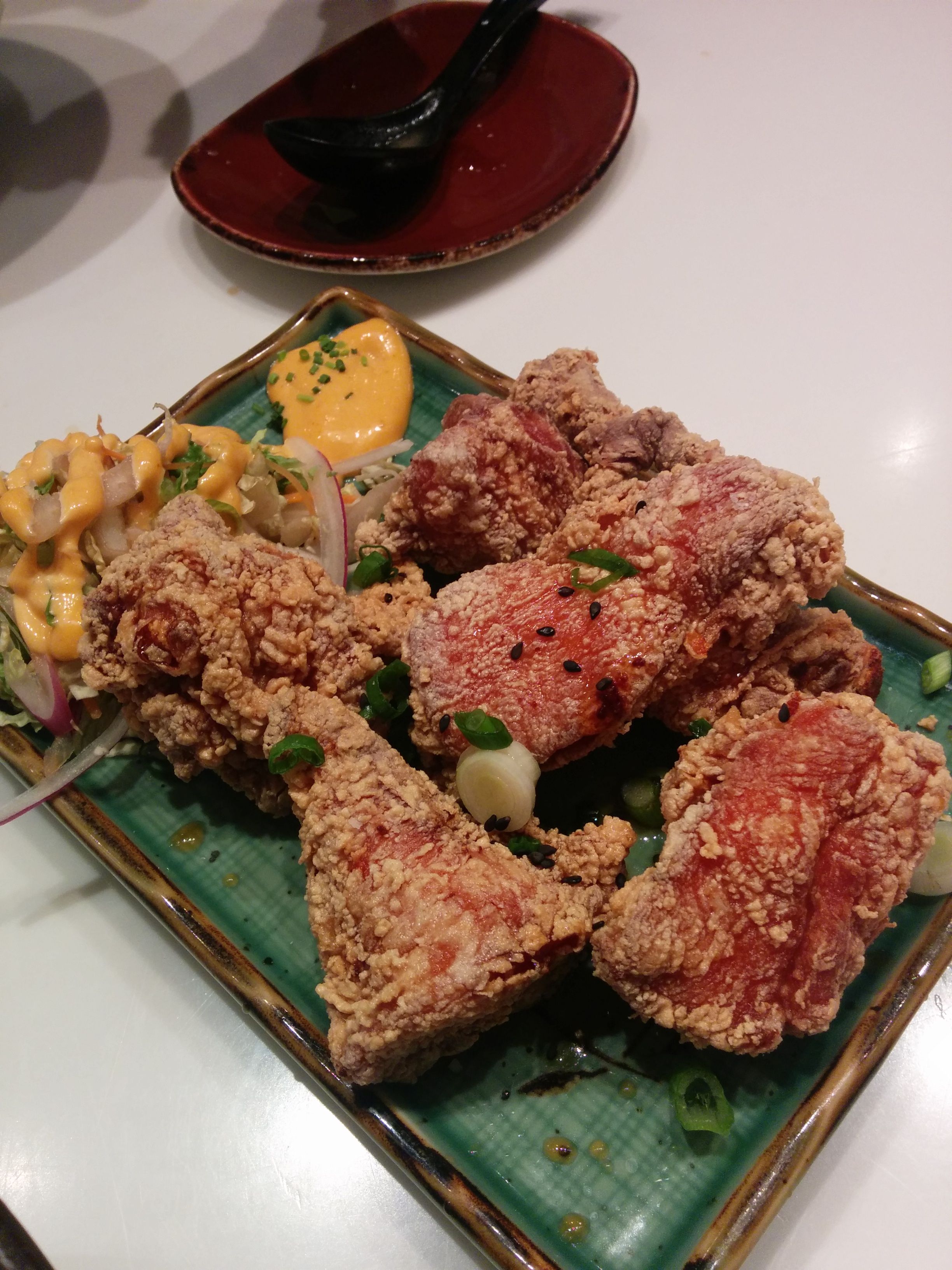 The dumplings had a taste that I wasn’t familiar with. I wouldn’t say they were bad but there was a taste that felt odd on the pallet, nothing to write home about. I found comments with similar opinions about the dumplings online. The duck fried chicken ‘nuggets’ if you will were absolutely tender and delicious as was the accompanying side of salad and dressing/sauce for the chicken.
