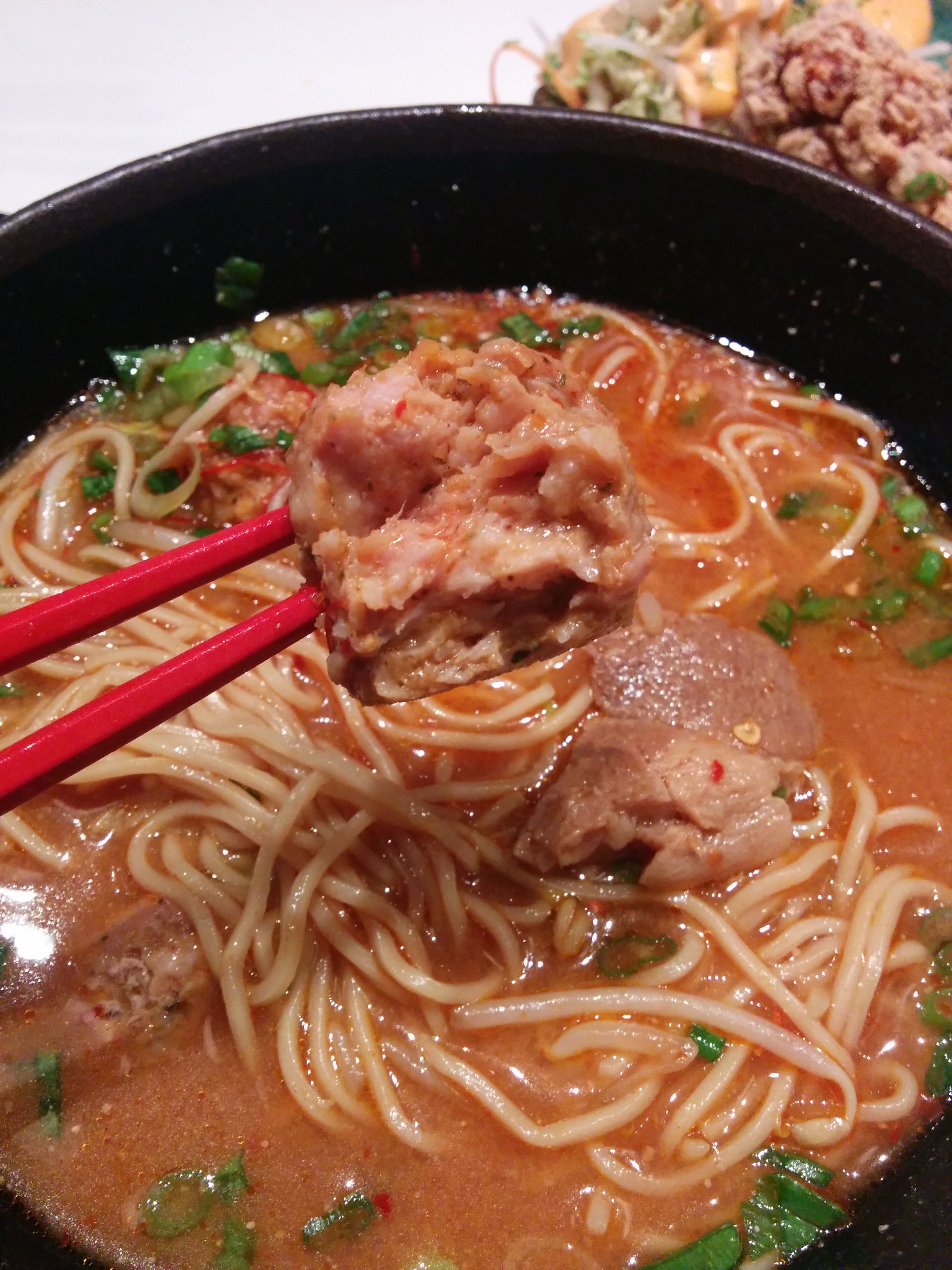 For the main course if you will I ordered the Tan Tan Men Ramen (spicy) homemade ramen noodles, pork meatball, pork chashu, pork miso, bok choy, bean sprouts while mom went with the Tonkotsu homemade ramen noodles, silky pork broth, pork chashu, bok choy, molten egg, naruto, chili oil.
