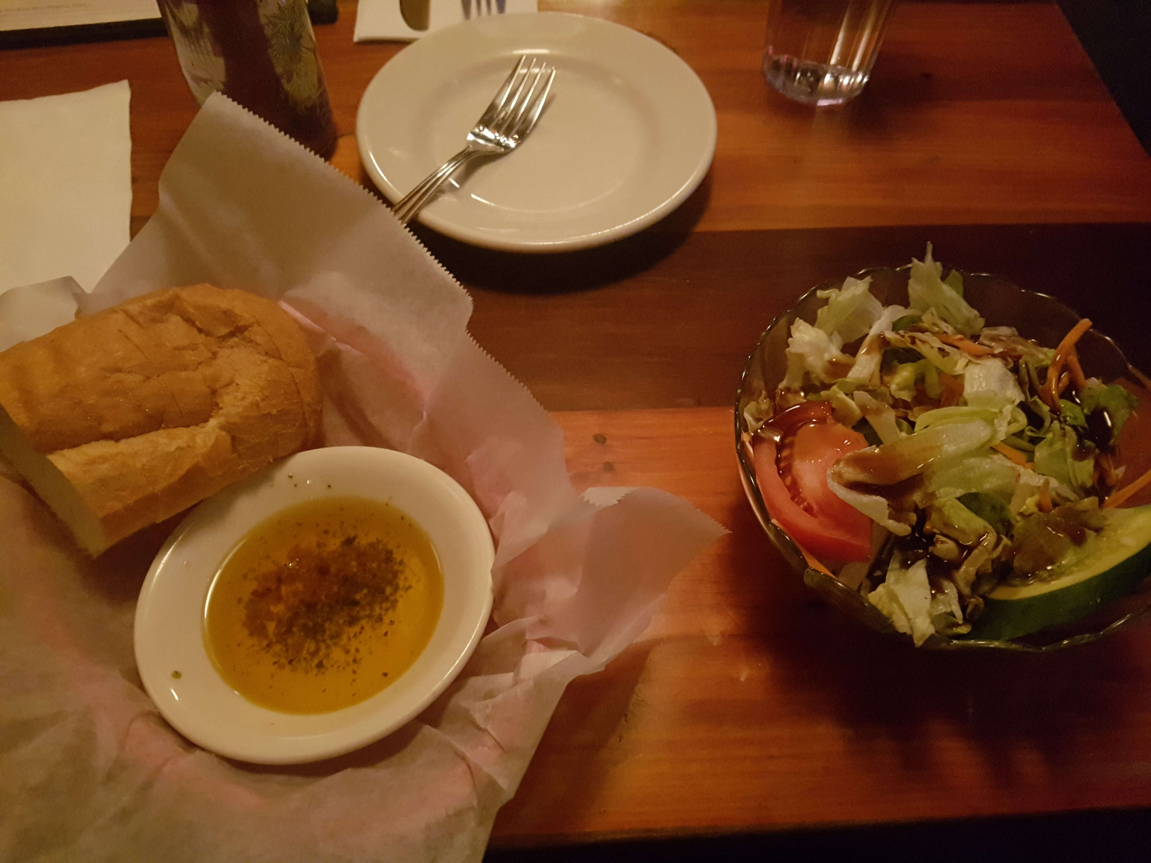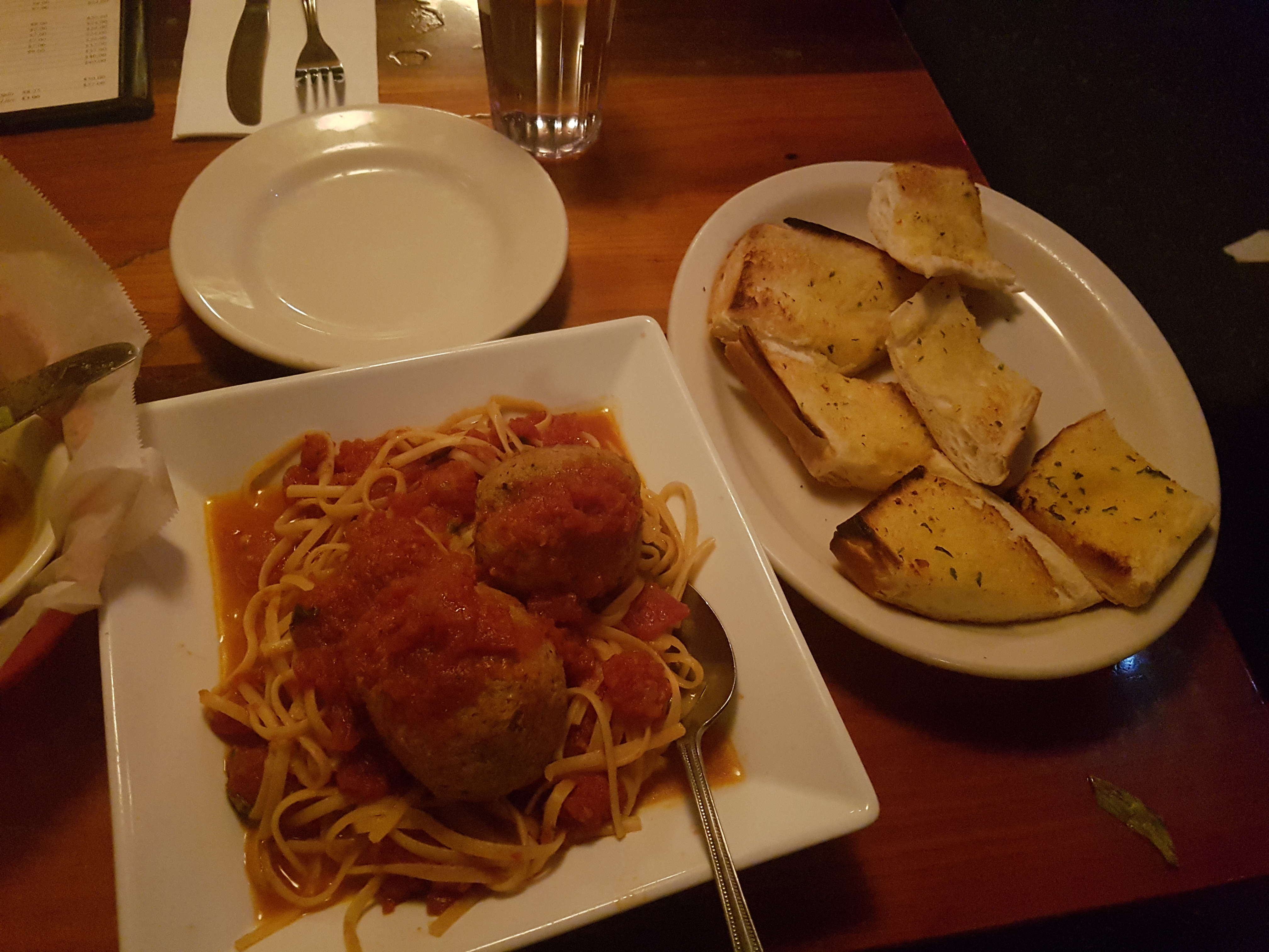 The food was great and the atmosphere friendly. I had the spaghetti and meatballs along with a salad and a side of garlic bread. The food was tasty, the prices were reasonable, the service adequate and the atmosphere was warm.