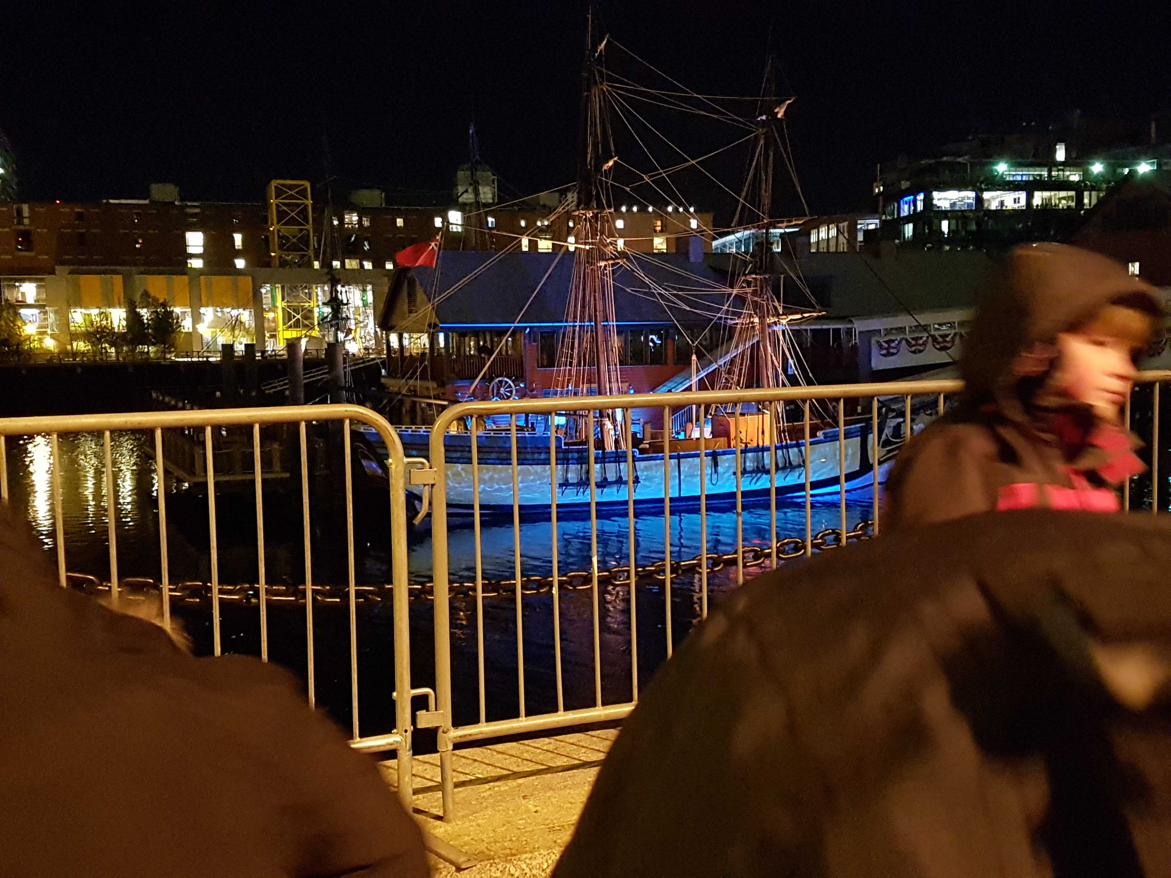 Although it was after dark and fairly cold, it didn’t really affect me until we got to the docks and sat down. The bite from the cold air really started to take it’s toll. The re-enactment itself was ok. I felt that it didn’t “flow” correctly. For example as they dumped some of the tea over board, the men on deck then proceed to empty out the cargo hold to reach additional bundles of tea. This may be historically correct but I think for the performance it could have been better executed.
