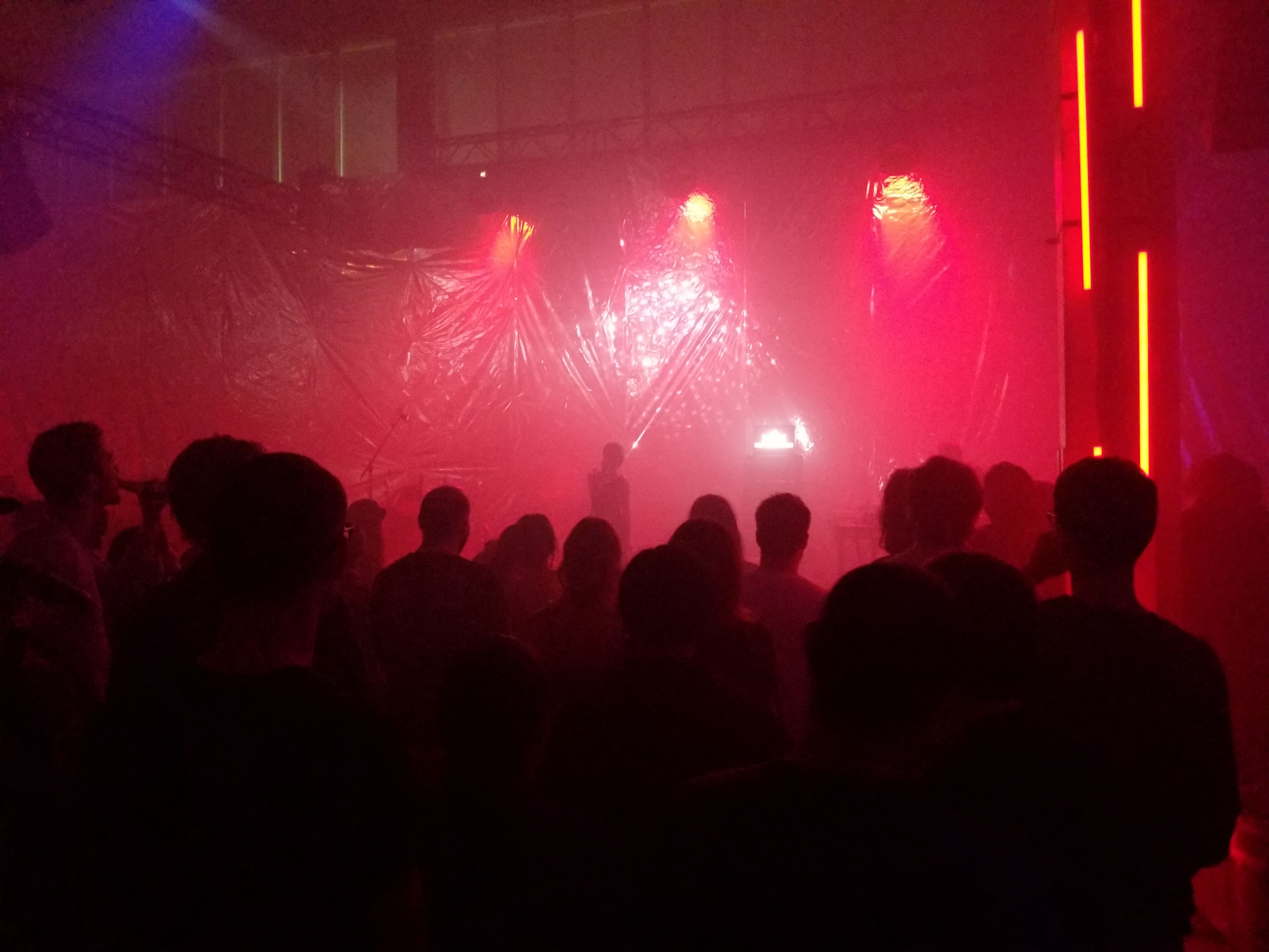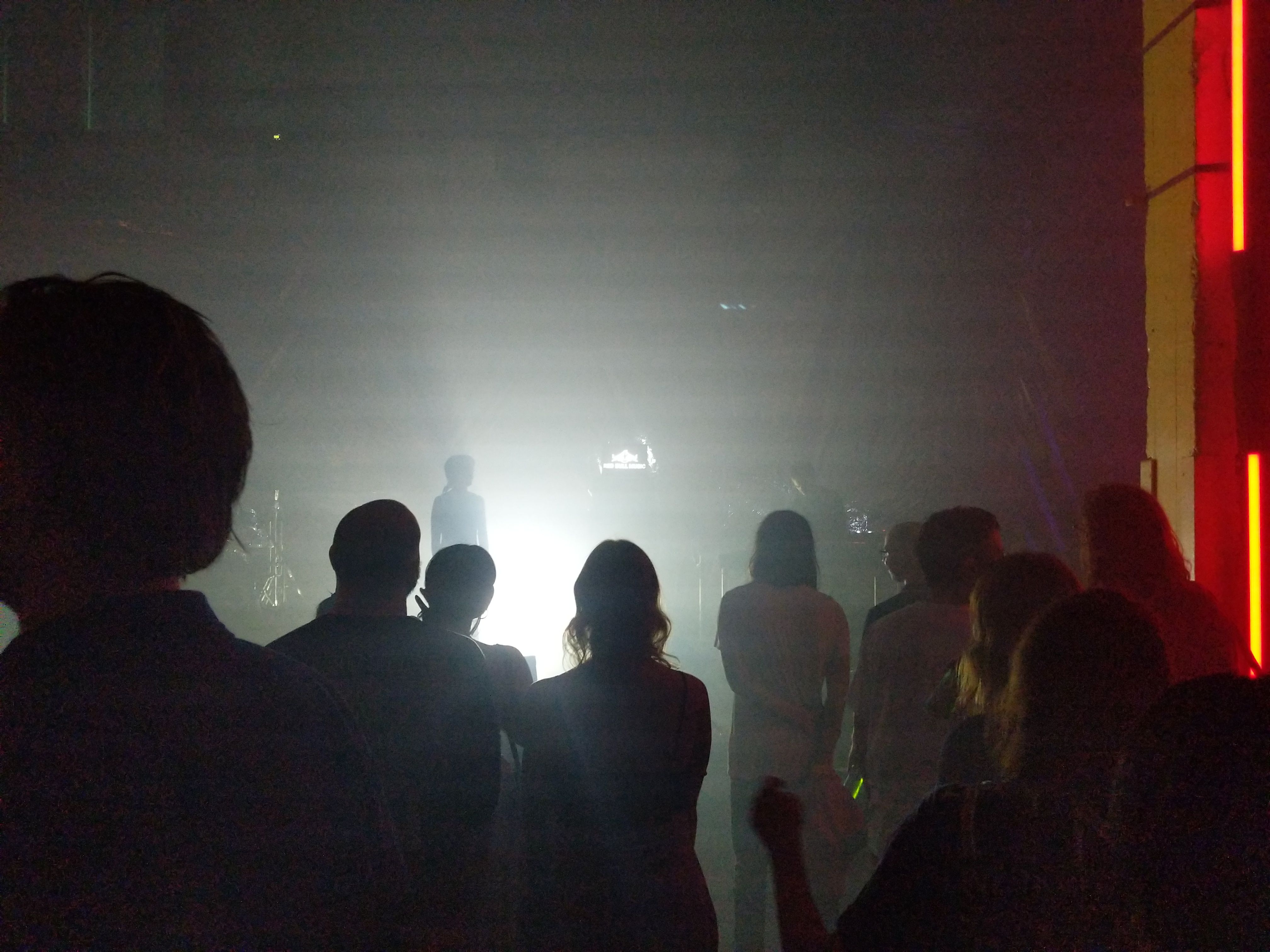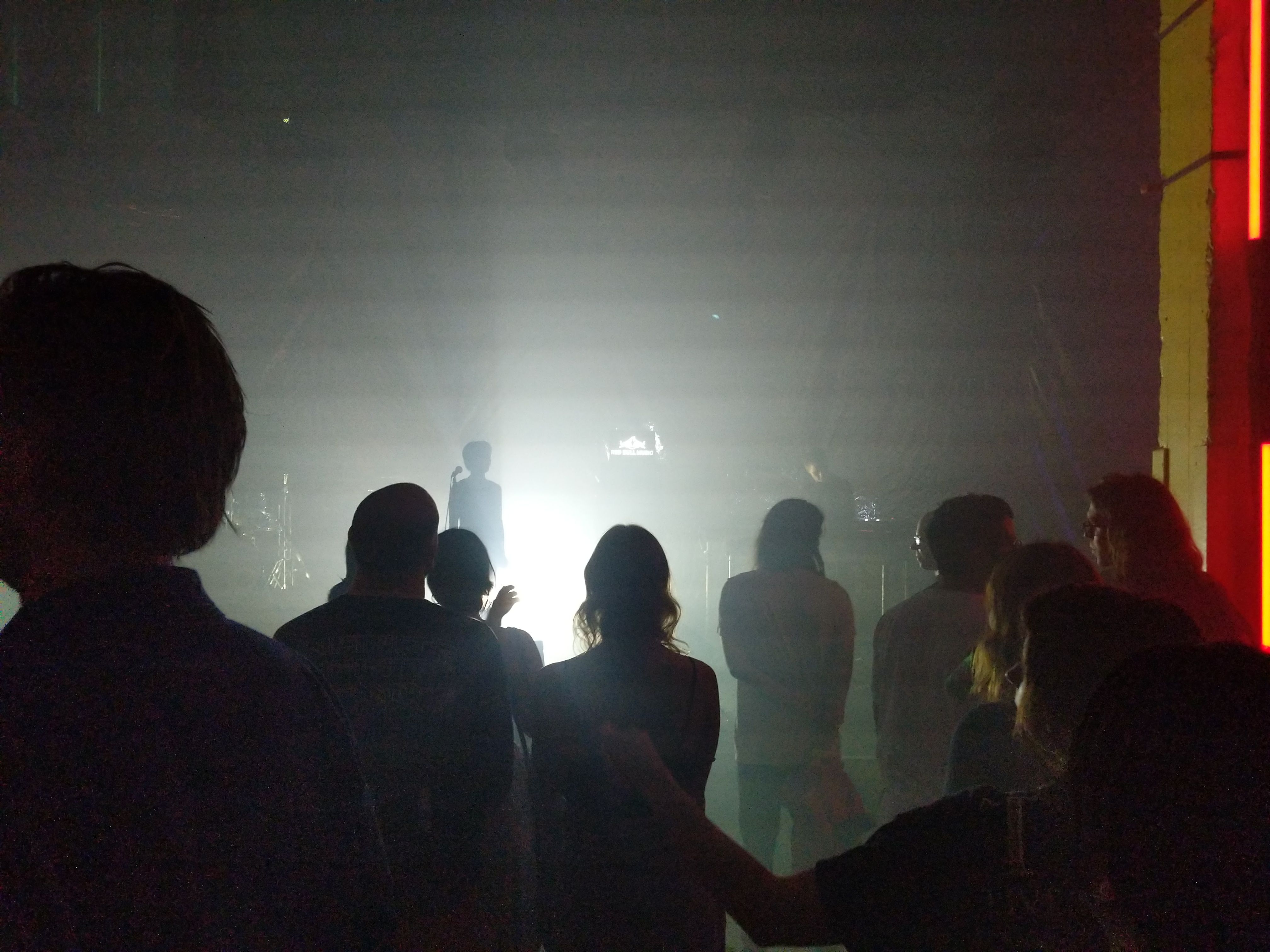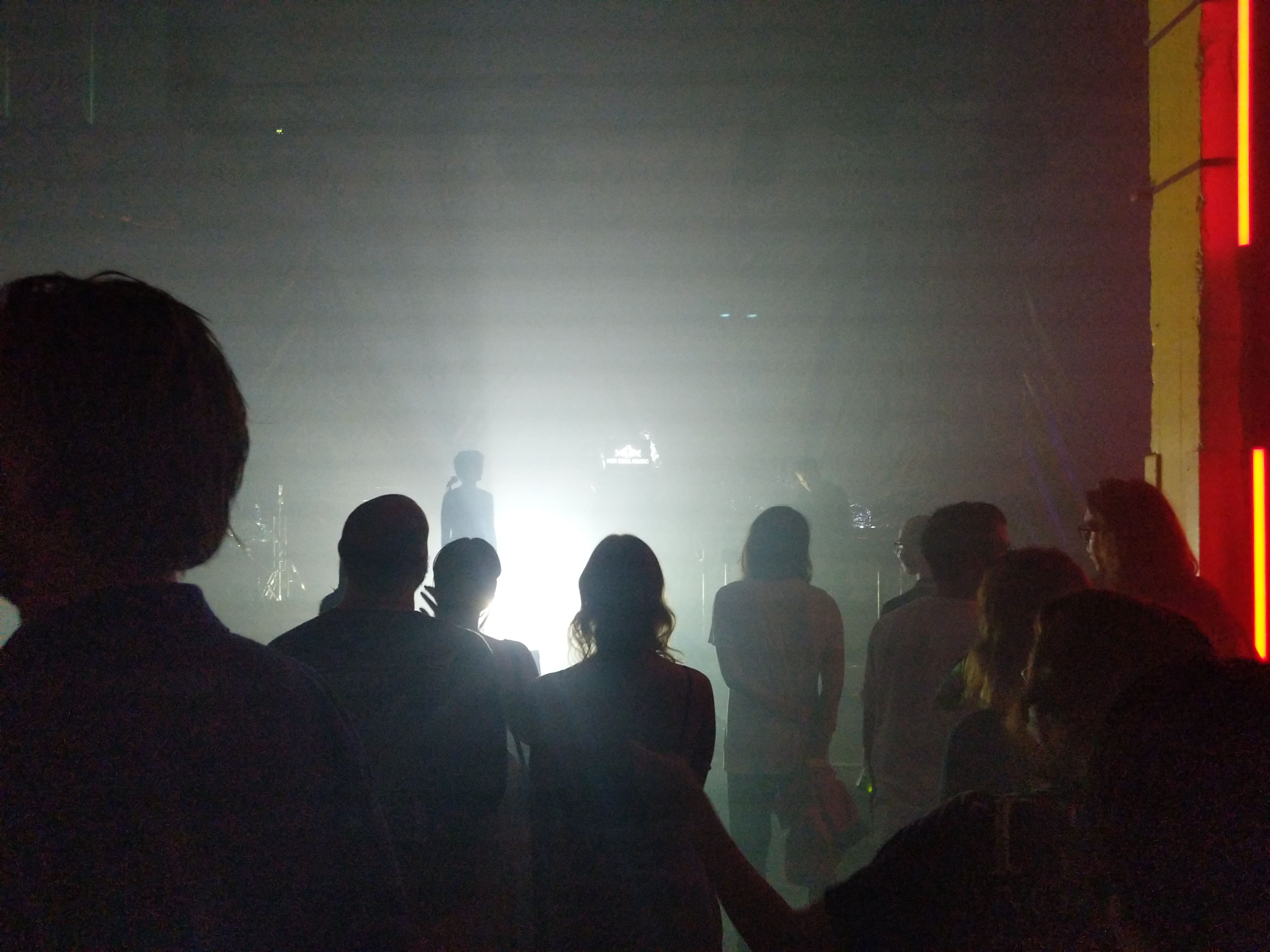 I walked around the space. They had a nice bar area, merchandise table, washrooms setup to the right of the entrance. You had to take a few steps down to reach it. There was a large stage along the primary wall of the warehouse and further to it’s left you had some common areas setup with living art spaces. The whole place was rather dimly lit but this went with the team of neon lighting. There were some art pieces placed around the room.