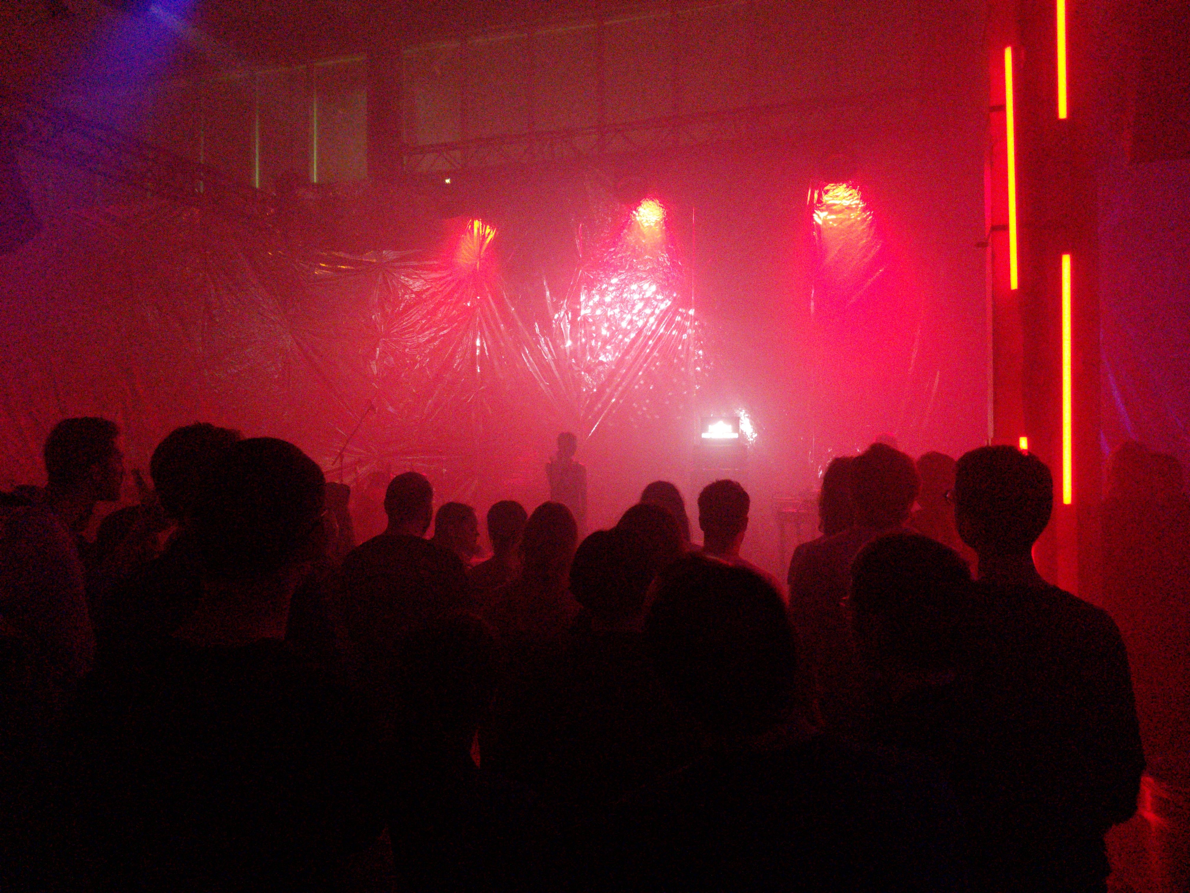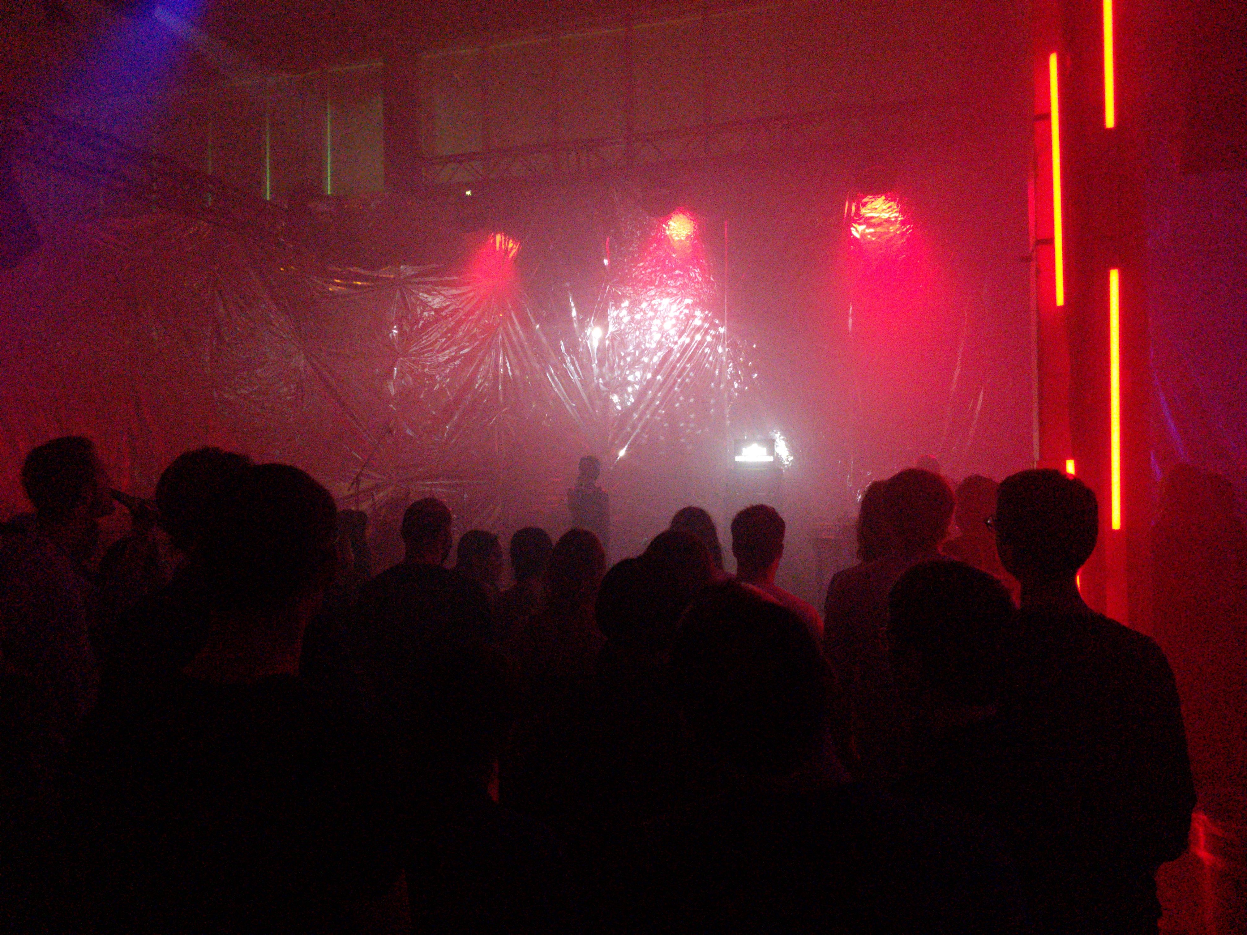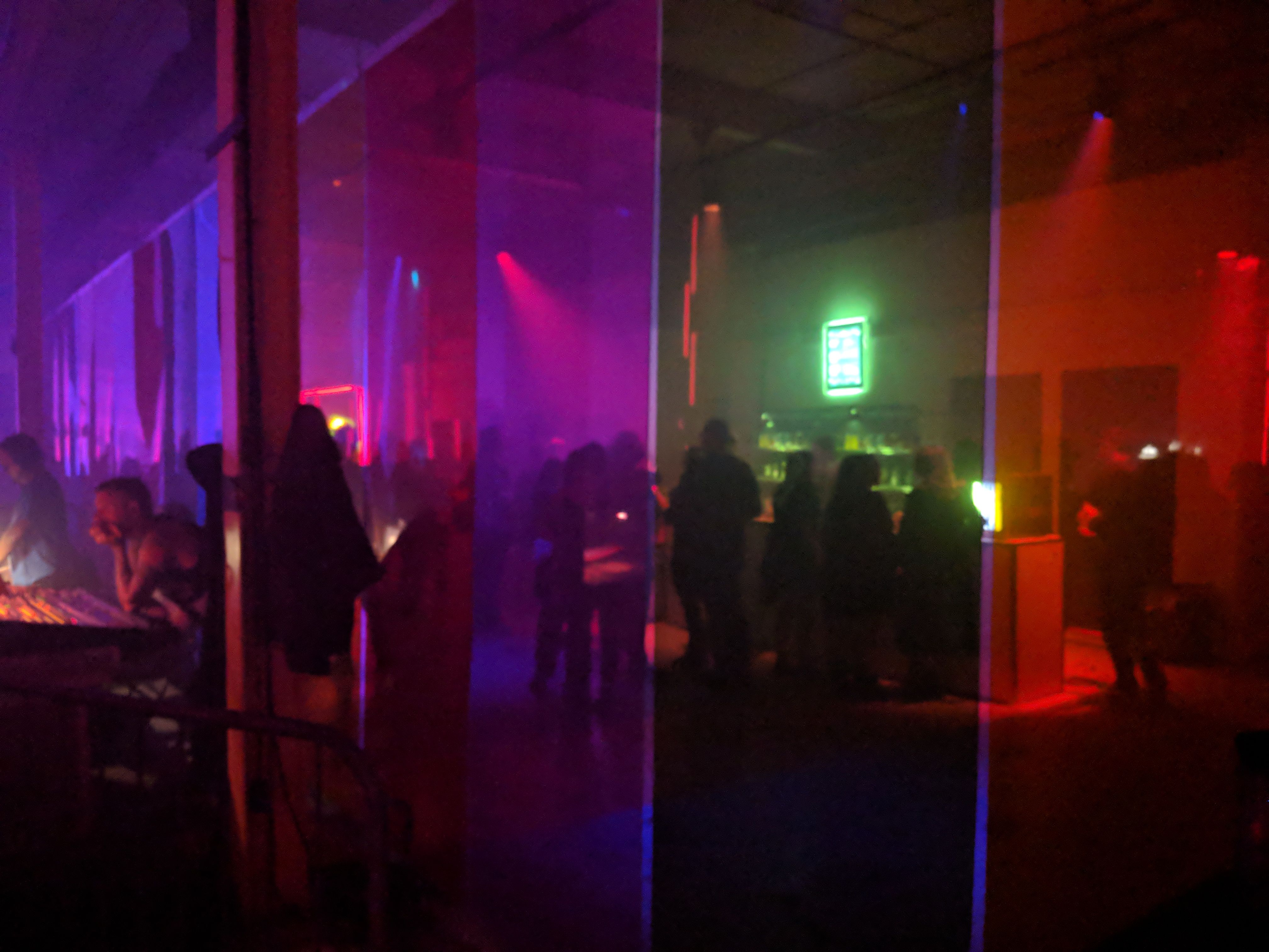 I walked around the space. They had a nice bar area, merchandise table, washrooms setup to the right of the entrance. You had to take a few steps down to reach it. There was a large stage along the primary wall of the warehouse and further to it’s left you had some common areas setup with living art spaces. The whole place was rather dimly lit but this went with the team of neon lighting. There were some art pieces placed around the room.