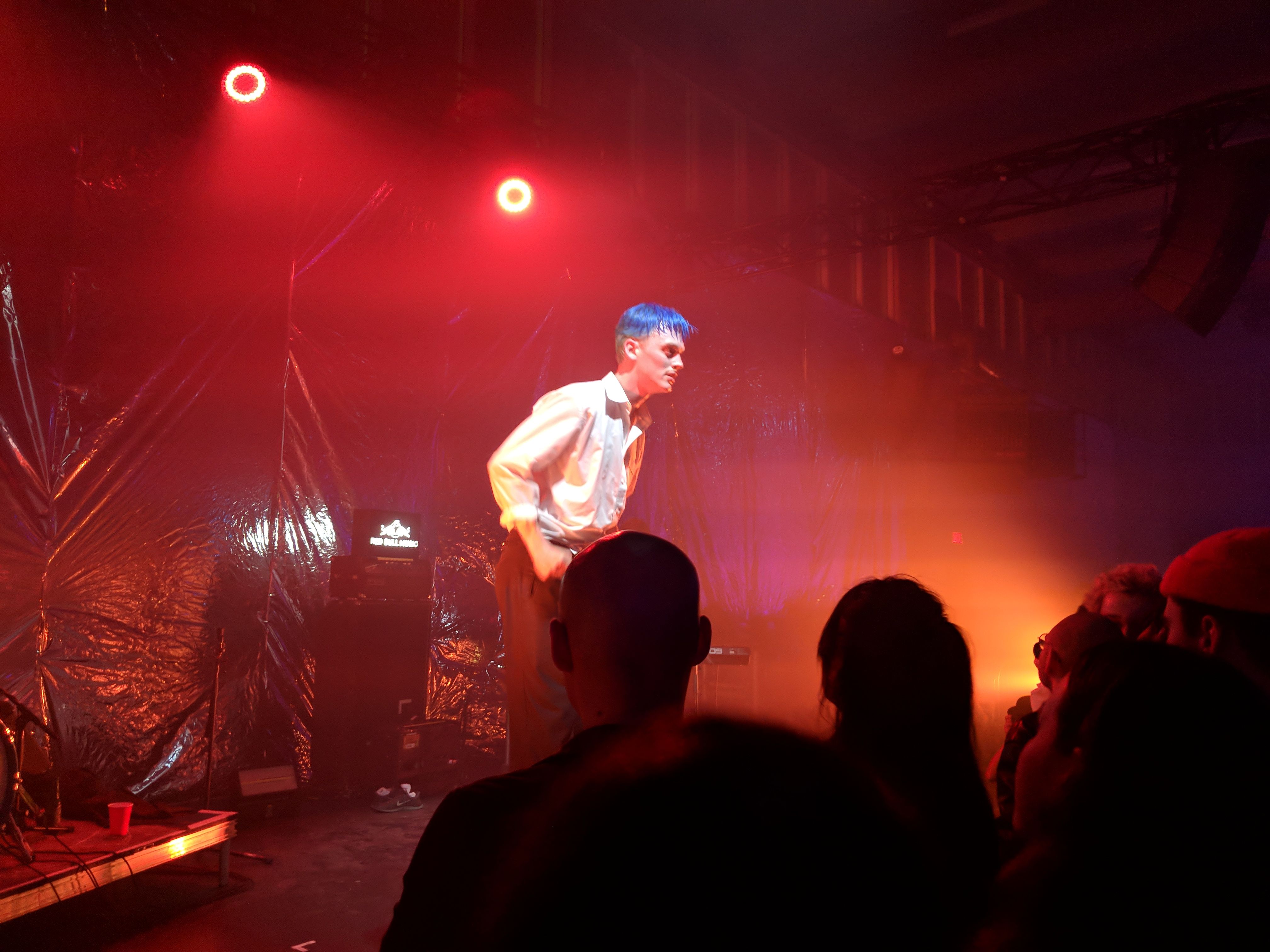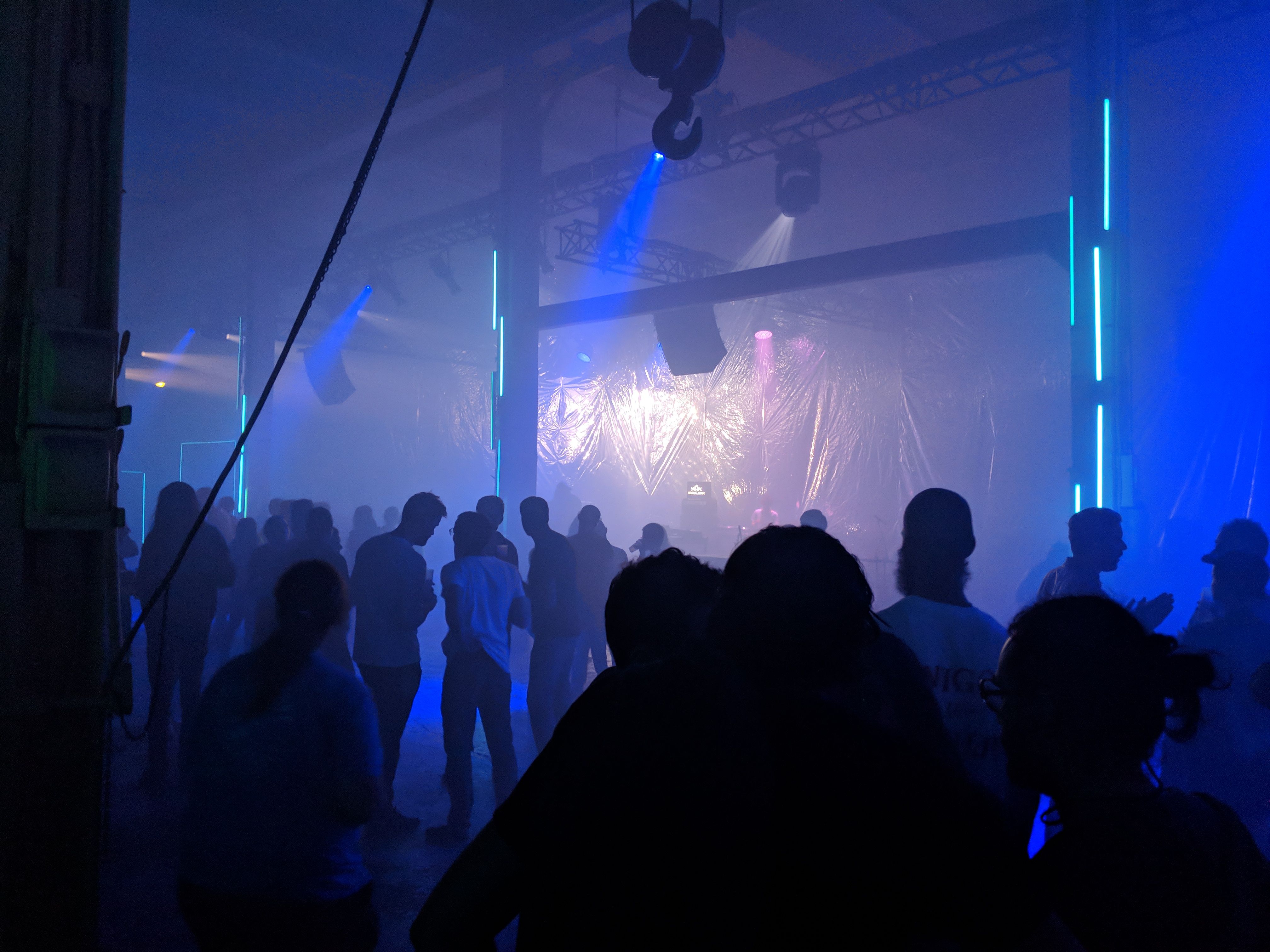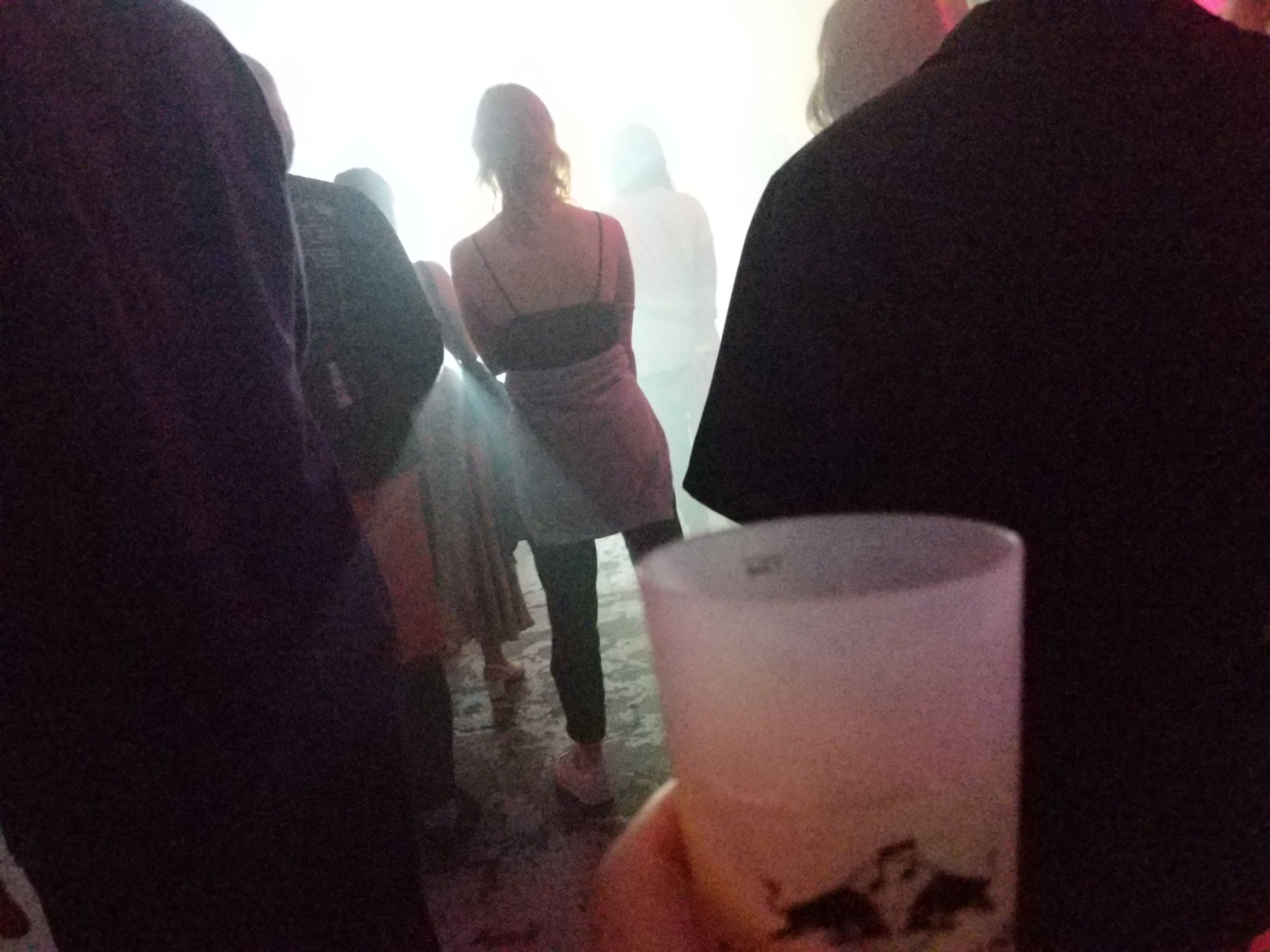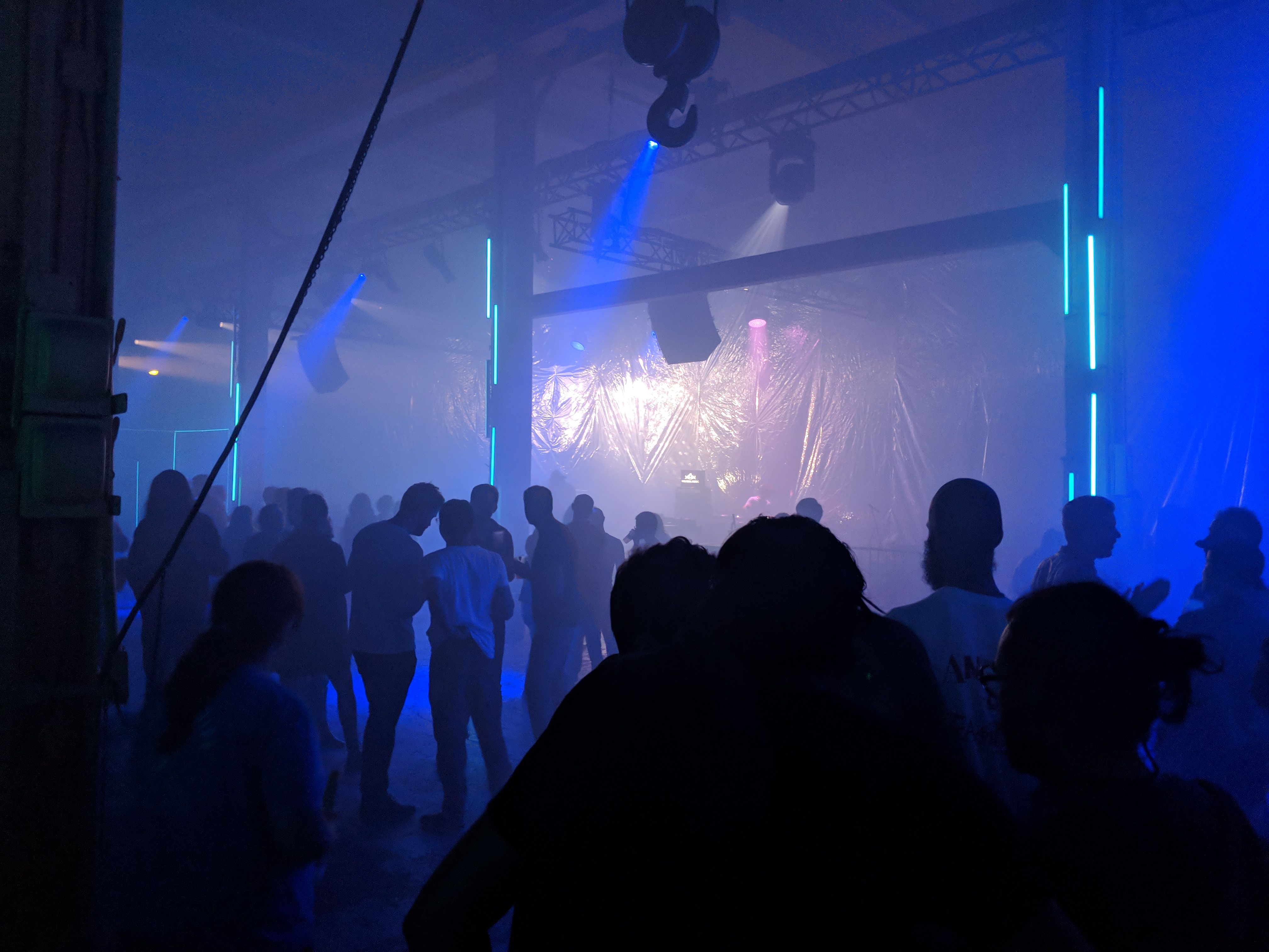 I walked around the space. They had a nice bar area, merchandise table, washrooms setup to the right of the entrance. You had to take a few steps down to reach it. There was a large stage along the primary wall of the warehouse and further to it’s left you had some common areas setup with living art spaces. The whole place was rather dimly lit but this went with the team of neon lighting. There were some art pieces placed around the room.